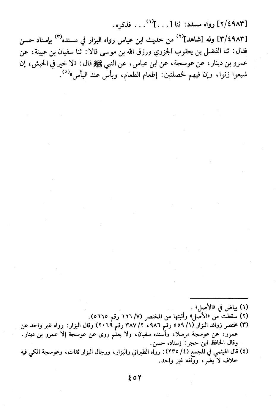 4983 / 3 - وَلَهُ شَاهِدٌ مِنْ حَدِيثِ ابْنِ عَبَّاسٍ رَوَاهُ الْبَزَّارُ فِي مُسْنَدِهِ بِإِسْنَادٍ حَسَنٍ فقال: ثنا الْفَضْلُ بْنُ يَعْقُوبَ الْجَزْرِيُّ وَرِزْقُ اللَّهِ بْنُ مُوسَى قَالَا: ثَنَا سُفْيَانُ بْنُ عُيَيْنَةَ، عَنْ عَمْرِو بْنِ دِينَارٍ، عَنْ عَوْسَجَةَ، عَنِ ابْنِ عَبَّاسٍ، عَنِ النَّبِيِّ - صَلَّى اللَّهُ عَلَيْهِ وَسَلَّمَ - قَالَ: "لَا خَيْرَ فِي الْحَبَشِ، إِنْ شَبِعُوا زَنَوْا، وَإِنَّ فِيهِمْ لَخَصْلَتَيْنِ: إِطْعَامُ الطَّعَامَ، وَبَأْسٌ عِنْدَ الْبَأْسِ ".
