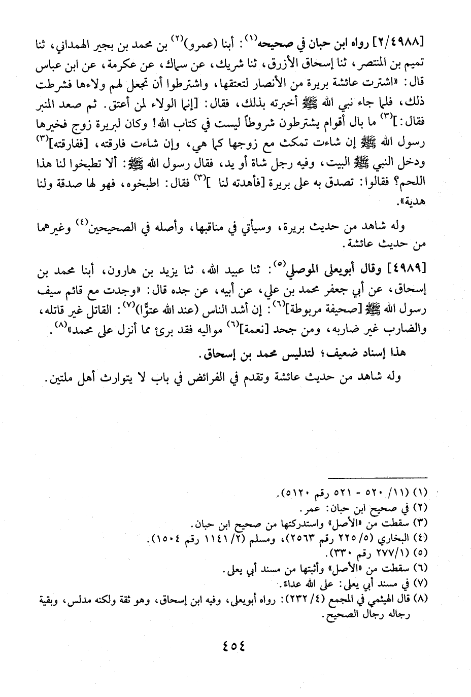 4988 / 2 - رواه ابن حبان في صحيحه: أبنا (عَمْرُو) بْنُ مُحَمَّدِ بْنِ بُجَيْرٍ الْهَمْدَانِيُّ، ثَنَا تَمِيمُ بْنُ الْمُنْتَصِرِ، ثَنَا إِسْحَاقُ الْأَزْرَقُ، ثَنَا شريك، عن سماك، عدت عكرمة، عن ابن كباس قَالَ: "اشْتَرَتْ عَائِشَةُ بَرِيرَةَ مِنَ الْأَنْصَارِ لِتُعْتِقَهَا، وَاشْتَرَطُوا أَنْ تَجْعَلَ لَهُمْ وَلَاءَهَا فَشَرَطَتْ ذَلِكَ، فلما جاء نبي الله أخبرته بذلك، فقال: إنما الولاء لمن أعتق. ثم صعد المنبر فقال: ما بال أقوام يشترطون شروطاً ليسمت في كتاب الله! وكان لبريرة زوج فخيرها رسول الله - صلى الله عليه وسلم - إن شاءت تمكث مع زوجها كما طي، وإن شاءت فارقته ففارقته وَدَخَلَ النَّبِيُّ - صَلَّى اللَّهُ عَلَيْهِ وَسَلَّمَ - الْبَيْتَ، وَفِيهِ رِجْلُ شَاةٍ أَوْ يَدٌ، فَقَالَ رَسُولُ اللَّهِ - صَلَّى اللَّهُ عَلَيْهِ وَسَلَّمَ -: أَلَا تَطْبُخُوا لَنَا هَذَا اللَّحْمَ؟ فَقَالُوا: تُصُدِّقَ بِهِ عَلَى بريرة فأهدته لنا، فَقَالَ: اطْبُخُوهُ، فَهُوَ لَهَا صَدَقَةٌ وَلَنَا هَدِيَةٌ".