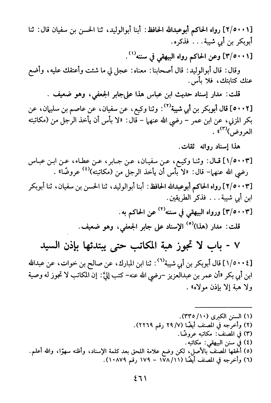 5004 / 1 - قَالَ أَبُو بَكْرِ بْنُ أَبِي شَيْبَةَ: ثَنَا ابْنُ الْمُبَارَكِ، عَنْ صَالِحِ بْنِ خوات، عن عبد الله ابن أبي بكر "أن عمر بن عجدالعزيز- رَضِيَ اللَّهُ عَنْهُ- كَتَبَ إليَّ: أَنَّ الْمُكَاتَبَ لَا تَجُوزُ لَهُ وَصِيَّةٌ وَلَا هِبَةٌ إِلَّا بإذن مولاه".