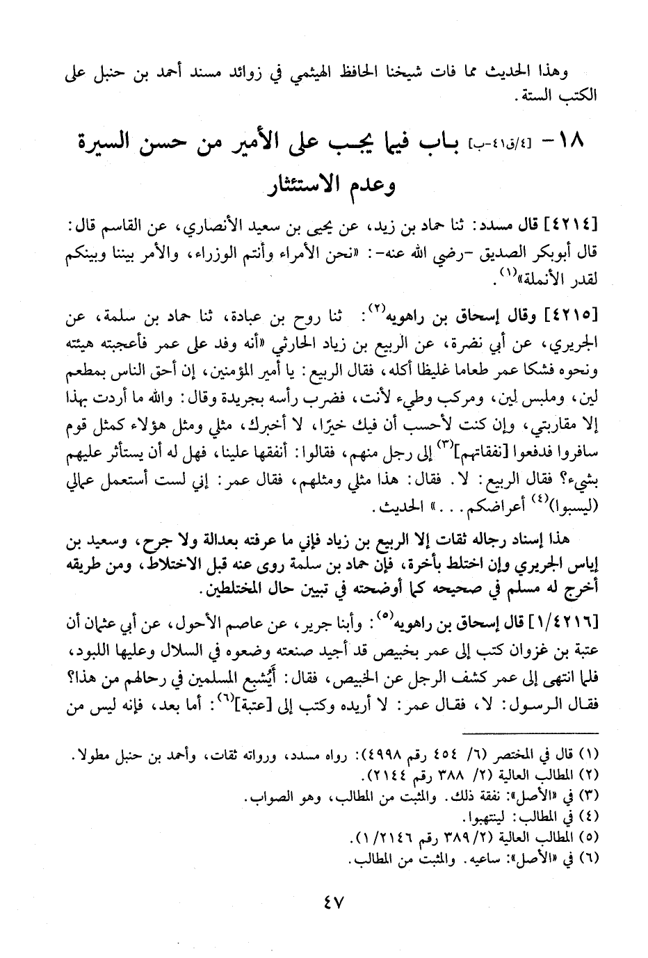 4215 - وَقَالَ إِسْحَاقُ بْنُ رَاهَوَيْهِ: ثَنَا رَوْحُ بْنُ عُبَادَةَ، ثَنَا حَمَّادُ بْنُ سَلَمَةَ، عَنِ الْجَرِيرِيِّ، عَنْ أَبِي نَضْرَةَ، عَنِ الرَّبِيعِ بْنِ زِيَادٍ الْحَارِثِيِّ "أَنَّهُ وَفَدَ عَلَى عُمَرَ فَأَعْجَبَتْهُ هَيْئَتُهُ ونحوه فشكا عُمَرُ طَعَامًا غَلِيظًا أَكَلَهُ، فَقَالَ الرَّبِيعُ: يَا أَمِيرَ الْمُؤْمِنِينَ، إِنَّ أَحَقَّ النَّاسِ بِمَطْعَمٍ لَيِّنٍ، وَمَلْبَسٍ لَيِّنٍ، وَمَرْكَبٍ وَطِيءٍ لَأَنْتَ، فَضَرَبَ رَأْسَهُ بِجَرِيدَةٍ وَقَالَ: وَاللَّهِ مَا أَرَدْتَ بِهَذَا إِلَّا مُقَارَبَتِي، وَإِنْ كُنْتُ لَأَحْسَبُ أَنَّ فِيكَ خَيْرًا، لا أُخْبِرُكَ، مَثَلِي وَمَثَلَ هَؤُلَاءِ كَمَثَلِ قَوْمٍ سَافَرُوا فدفعوا نفقاتهم، إِلَى رَجُلٍ مِنْهُمْ، فَقَالُوا: أَنْفِقْهَا عَلَيْنَا، فَهَلْ له أن يستأثر عليهم بشيء؟ فَقَالَ الرَّبِيعُ: لَا. فَقَالَ: هَذَا مَثَلِي وَمَثَلُهُمْ، فَقَالَ عُمَرُ: إِنِّي لَسْتُ أَسْتَعْمِلُ عُمَّالِي لِيَسُبُّوا) أعرا ضكم ... " الْحَدِيثَ.