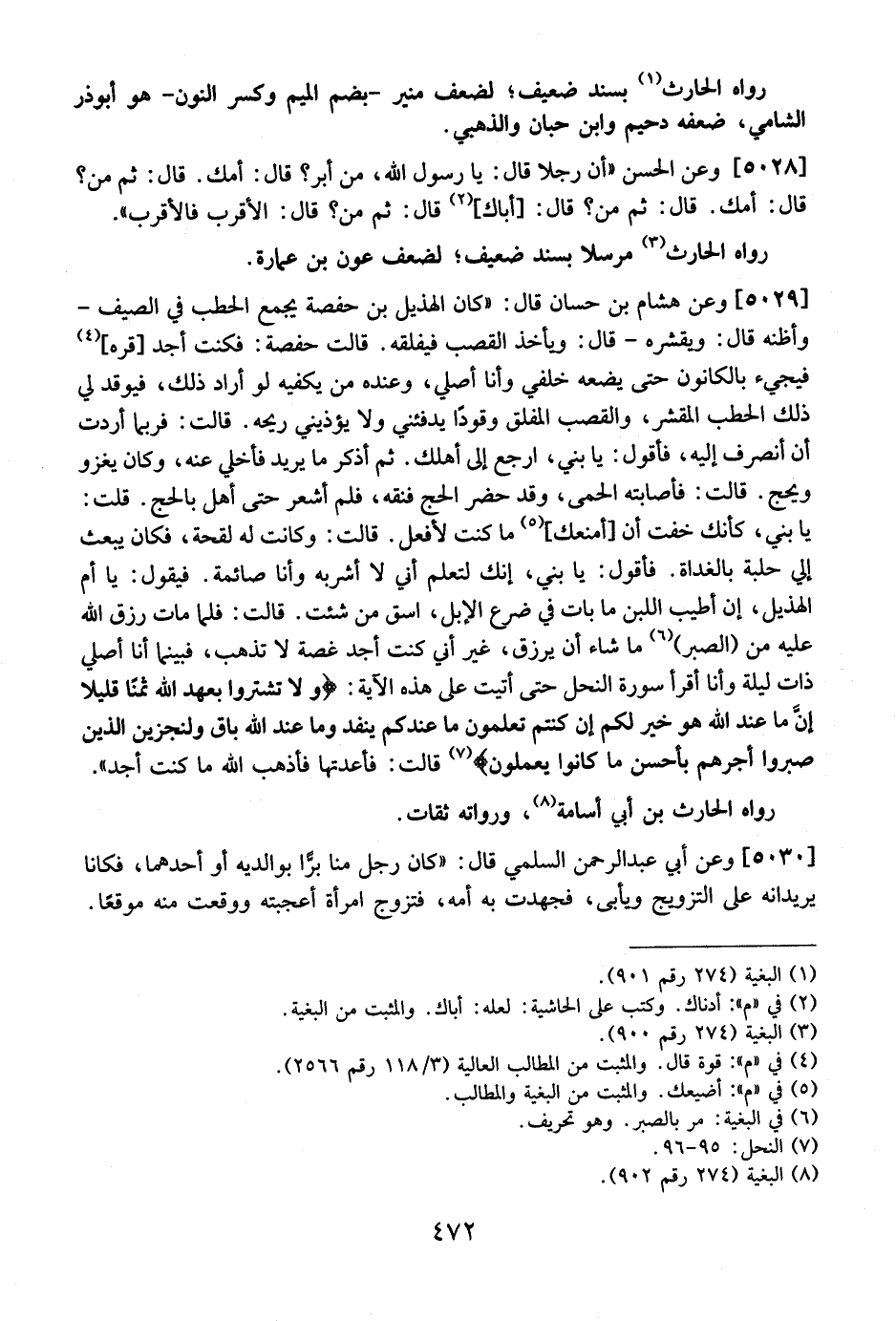 5028 - وعن الحسن "أن رجلا قال: يا رسول الله، من أبر؟ قال: أمك. قال: ثم من؟ قال: أمك. قال: ثم من؟ قال: أباك، قال: ثم من؟ قال: الأقرب فا لأقرب ". رواه الحارث مرسلا بسند ضعيف؛ لضعف عون بن عمارة.