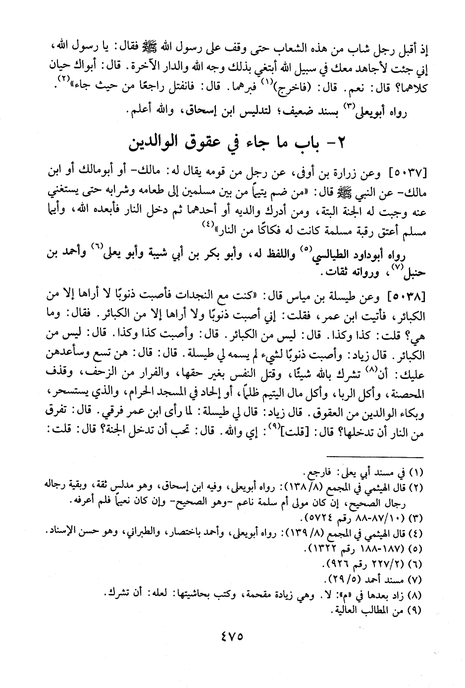 5038 - وعن طيسلة بن مياس قَالَ: "كُنْتُ مَعَ النَّجْدَاتِ فَأَصَبْتُ ذُنُوبًا لَا أَرَاهَا إِلَّا مِنَ الْكَبَائِرِ، فَأَتَيْتُ ابْنَ عُمَرَ، فقلت: إني أصبت ذنوبًا ولا أراها إلا من الكبائر. فقال: وما هي؟ قلت: كذا وكذا. قال: ليس من الكبائر. قال: وأصبت كذا وكذا. قال: ليس من الكبائر. قال زياد: وأصبت ذنوبًا لشيء لم يسمه لي طيسلة. قال: قال: هن تسع وسأعدهن عليك: أن تشرك بالله شيئًا، وَقَتْلُ النَّفْسِ بِغَيْرِ حَقِّهَا، وَالْفِرَارُ مِنَ الزَّحْفِ، وَقَذْفُ الْمُحْصَنَةِ، وَأَكْلُ الرِّبَا، وَأَكْلُ مَالِ الْيَتِيمِ ظلماً، أو إلحاد في المسجد الحرام، والذي يستسحر، وبكاء الوالدين من العقوق. قال زياد: قال لي طيسلة: لما رأى ابن عمر فرقي. قال: تفرق من النار ان تدخلها؟ قال: قلت: إي والله. قال: تحب أن تدخل الجنة؟ قال: قلت: