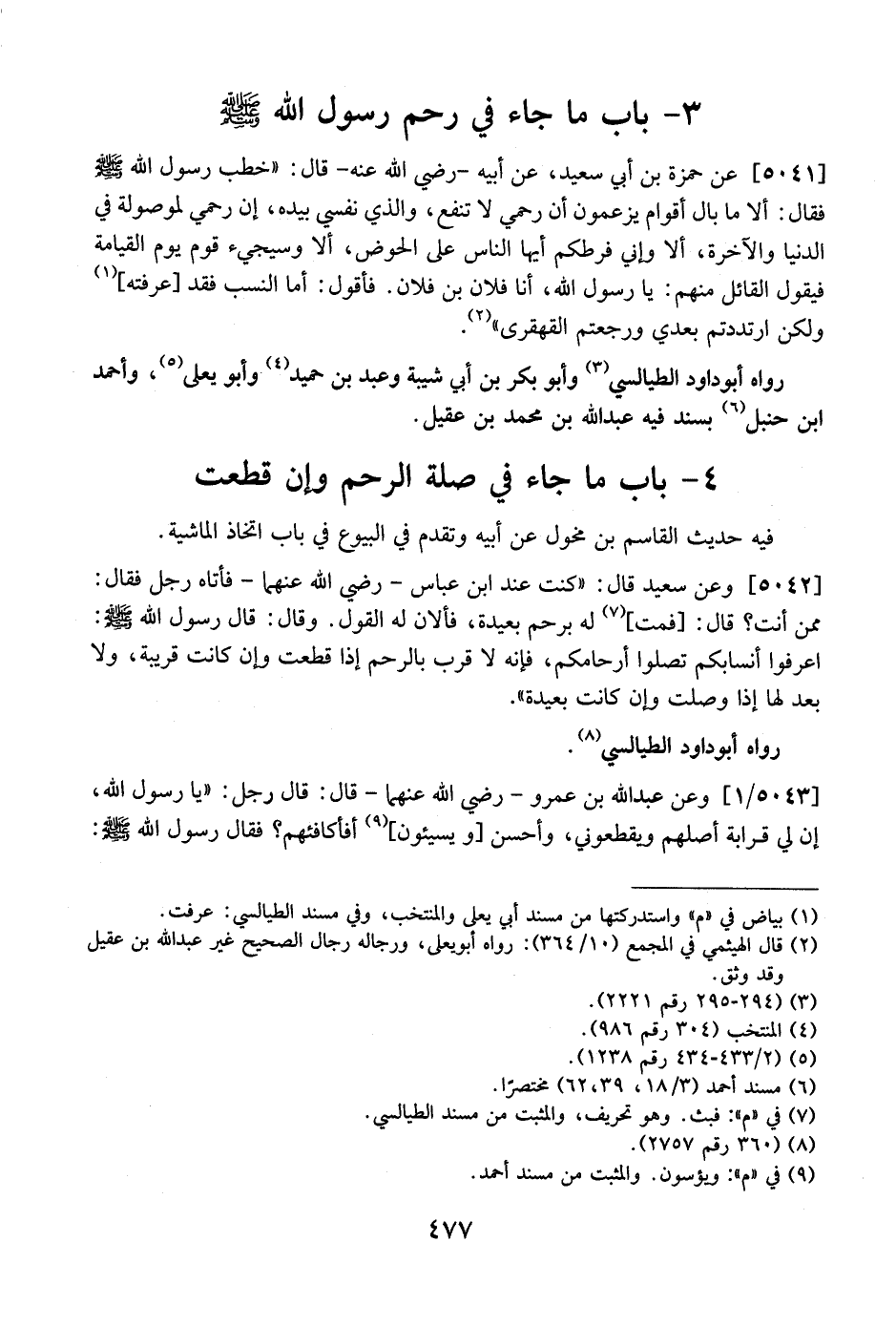 5042 - وعن سعيد قال: "كنت عند ابن عباس- رضي الله عنهما- فأتاه رجل فقال: ممن أنت؟ قال: أفمت، له برحم بعيدة، فألان له القول. وقال: قال رسول الله - صلى الله عليه وسلم -: اعْرَفُوا أَنْسَابَكُمْ تَصِلُوا أَرْحَامَكُمْ، فَإِنَّهُ لَا قُرْبَ بالرحم إِذَا قُطِعَتْ وَإِنْ كَانَتْ قَرِيبَةً، وَلَا بُعْدَ لها إذا وصلت وإن كانت بعيدة".
