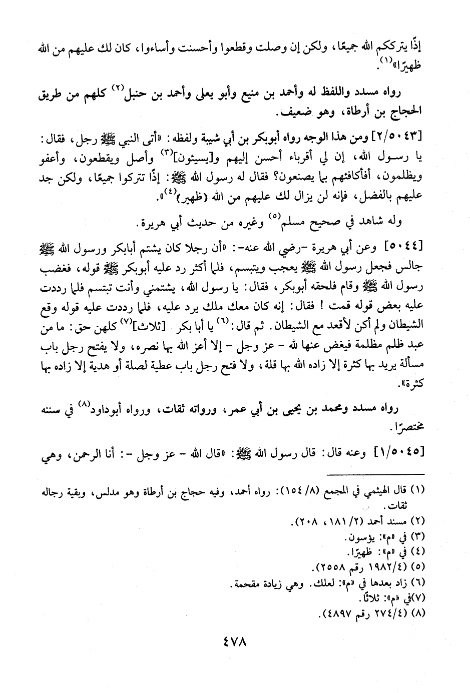 5044 - وَعَنْ أَبِي هُرَيْرَةَ- رَضِيَ اللَّهُ عَنْهُ-: "أَنَّ رَجُلًا كان يشتم أبابكر وَرَسُولُ اللَّهِ - صَلَّى اللَّهُ عَلَيْهِ وَسَلَّمَ - جَالِسٌ فَجَعَلَ رَسوُلُ اللَّهِ - صَلَّى اللَّهُ عَلَيْهِ وَسَلَّمَ - يَعْجَبُ ويتبسم، فلما أكثر رد عليه أبو بكر قوله، فَغَضِبَ رَسُولُ اللَّهِ - صَلَّى اللَّهُ عَلَيْهِ وَسَلَّمَ - وقام فلحقه أبو بكر، فقال: يا رسول الله، يشتمني وأنت تبتسم فلما رددت عليه بعض قوله قمت! فقال: إنه كان معك ملك يرد عليه، فلما رددت عليه قوله وقع الشيطان ولم أكن لأقعد مع الشيطان. ثم قال: يا أبا بكر أثلاث، كلهن حق: ما من عبد ظلم مظلمة فيغض عنها لله- عز وجل- إلا أعز الله بها نصره، ولا يفتح رجل باب مسألة يريد بها كثرة إلا زاده الله بها قلة، ولا فتح رجل باب عطية لصلة أو هدية إلا زاده بها كثرة".