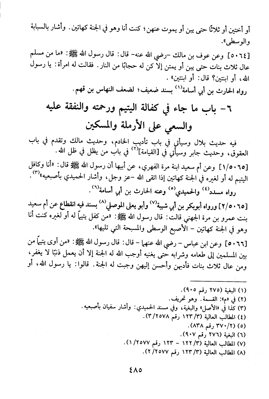 5065 / 2 - ورواه أبو بكر بن أبي شيبةأ) وأبو يعلى الموصلي بسند فيه انقطاع عن أم سعيد بنت عمرو بن مرة الْجُهَنِيِّ قَالَ: قَالَ رَسُولُ اللَّهِ - صَلَّى اللَّهُ عَلَيْهِ وسلم -: ((من كفل يتيماً له أو لغيره كنت أنا وهو في الجنة كهاتين- الأصبع الوسطى والمسبحة التي تليها".
