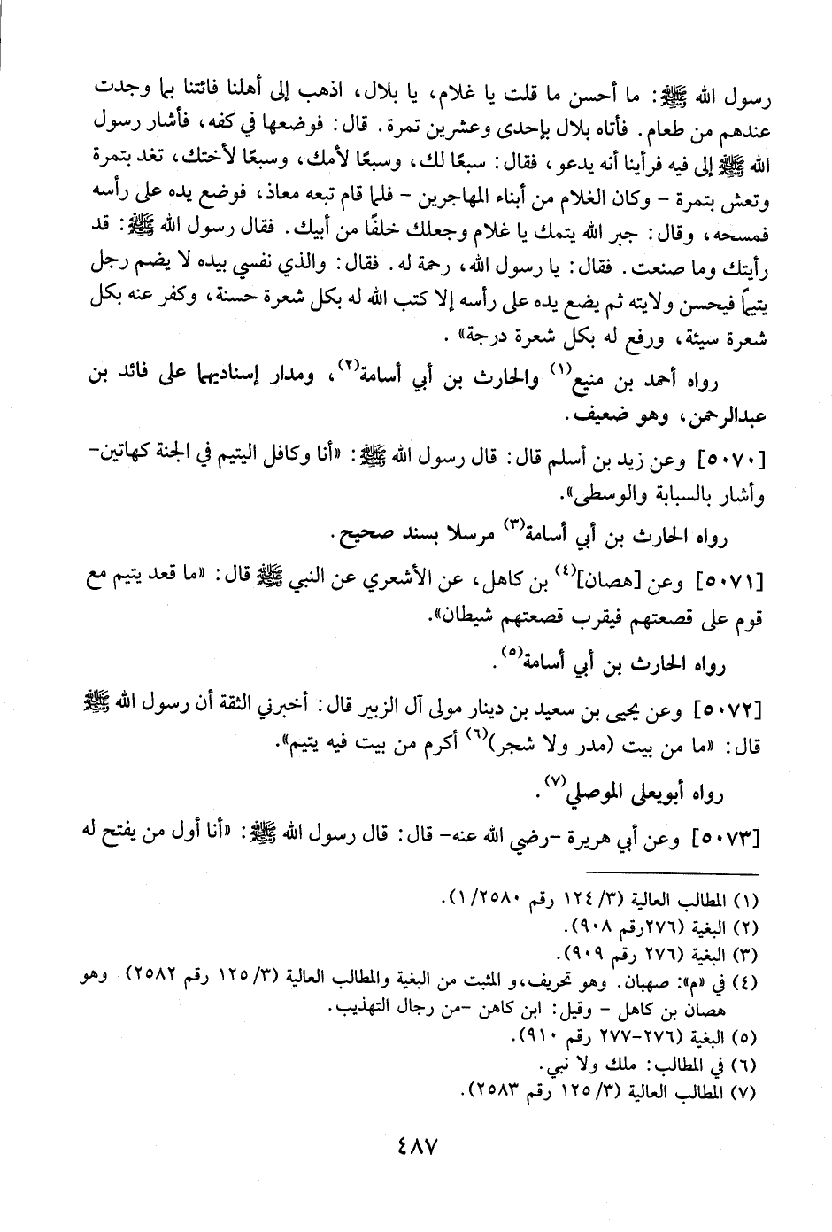 5072 - وعن يَحْيَي بْنِ سَعِيدِ بْنِ دِينَارٍ مَوْلَى آلِ الزُّبَيْرِ قَالَ: أَخْبَرَنِي الثِّقَةُ أَنّ رَسُولَ اللَّهِ - صَلَّى اللَّهُ عَلَيْهِ وَسَلَّمَ - قَالَ: "مَا مِنْ بيت (مدر ولا شجر) أكرم من بيت فيه يتيم ".