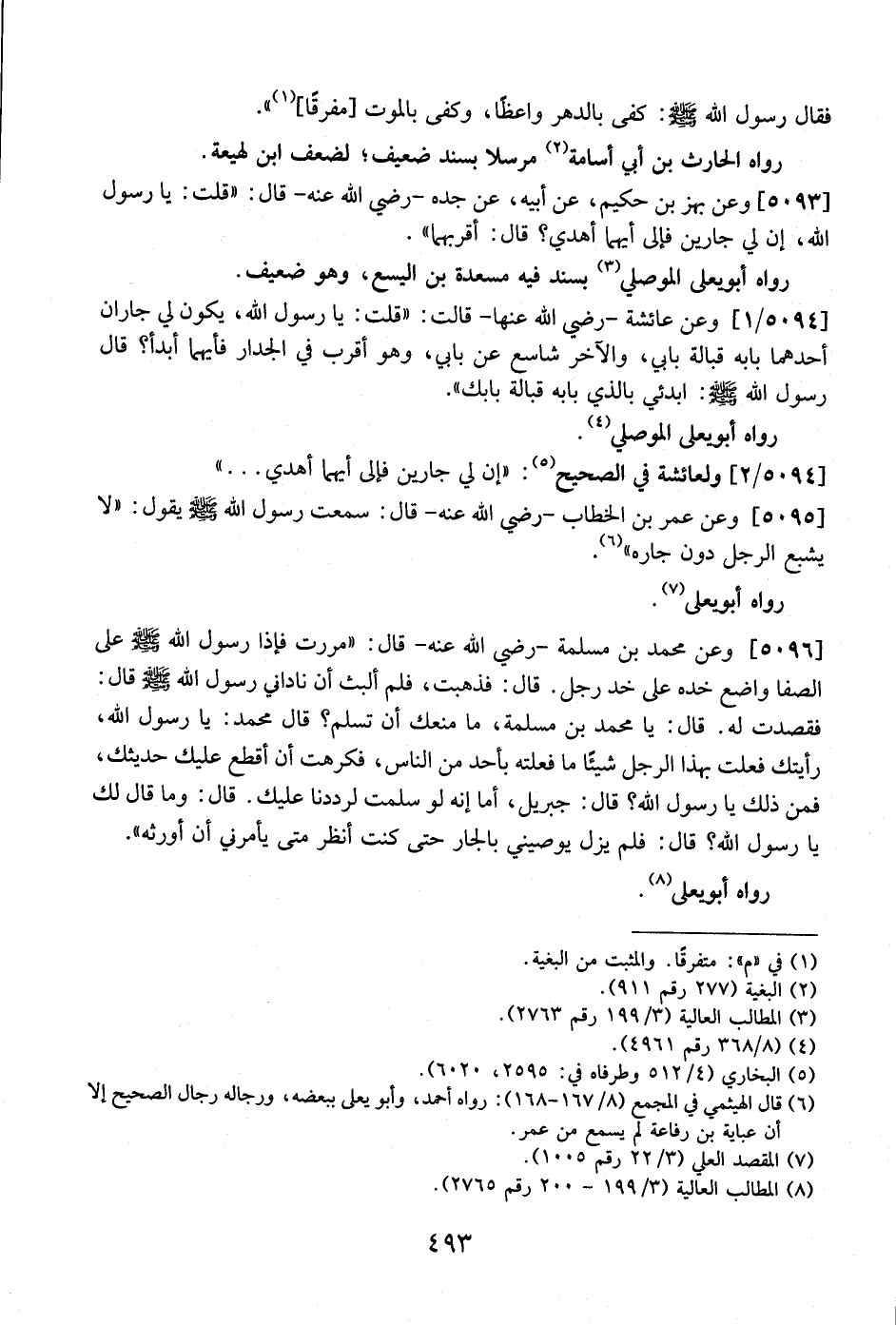 5096 - وعن محمد بن مسلمة- رضي الله عنه- قال: "مررت فَإِذَا رَسُولُ اللَّهِ - صَلَّى اللَّهُ عَلَيْهِ وَسَلَّمَ - على الصفا واضع خده على خد رجل. قال: فذهبت، فلم ألبث أن نَادَانِي رَسُولُ اللَّهِ - صَلَّى اللَّهُ عَلَيْهِ وَسَلَّمَ - قال: فقصدت له. قال: يا محمد بن مسلمة، ما منعك أن تسلم؟ قال محمد: يا رسول الله، رأيتك فعلت بهذا الرجل شيئًا ما فعلته بأحد من الناس، فكرهت أن أقطع عليك حديثك، فمن ذلك يا رسول الله؟ قال: جبريل، أما إنه لو سلمت لرددنا عليك. قال: وما قال لك يا رسول الله؟ قال: فلم يزل يوصيني بالجار حتى كنت أنظر متى يأمرني أن أورثه ".