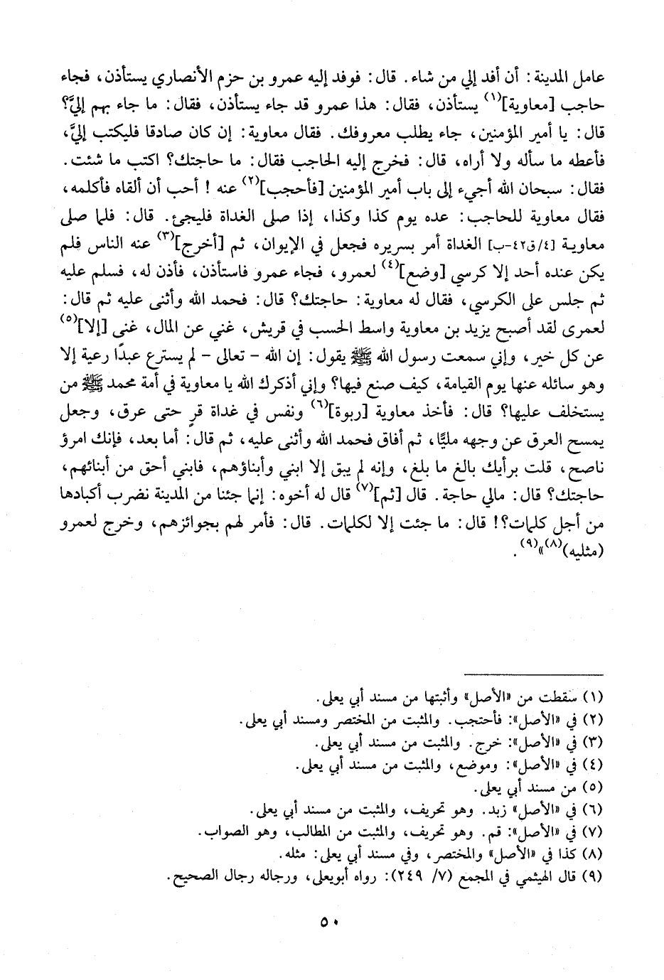 عَامِلِ الْمَدِينَةِ: أَنْ أَفِدْ إِلَيَّ مَنْ شَاءَ. قَالَ: فَوَفَدَ إِلَيْهِ عَمْرُو بْنُ حَزْمٍ الْأَنْصَارِيُّ يستأذن، فجاء حاجب معاوية، يَسْتَأْذِنُ، فَقَالَ: هَذَا عَمْرٌو قَدْ جَاءَ يَسْتَأْذِنُ، فَقَالَ: مَا جَاءَ بِهِمْ إليَّ؟ قَالَ: يَا أَمِيرَ الْمُؤْمِنِينَ، جَاءَ يَطْلُبُ مَعْرُوفَكَ. فَقَالَ مُعَاوِيَةُ: إِنْ كَانَ صَادِقًا فَلْيَكْتُبْ إليَّ، فَأَعْطِهِ مَا سَأَلَهُ وَلَا أَرَاهُ، قَالَ: فَخَرَجَ إِلَيْهِ الْحَاجِبُ فقال: ما حاجتيك؟ اكتب ما شئت. فقال: سبحان الله أجيء إلى باب أمير المؤمنين فأحجب، عَنْهُ! أُحِبُّ أَنْ أَلْقَاهُ فَأُكَلِّمَهُ، فَقَالَ مُعَاوِيَةُ للحاجب: عده يوم كذا وكذا، إذا صَلَّى الْغَدَاةَ فَلْيِجِئْ. قَالَ: فَلَمَّا صَلَّى مُعَاوِيَةُ الْغَدَاةَ أَمَرَ بِسَرِيرِهِ فَجُعِلَ فِي الْإِيوَانِ، ثُمَّ أَخْرَجَ، عَنْهُ النَّاسَ فَلَمْ يَكُنْ عِنْدَهُ أَحَدٌ إلا كرسي أوضع، لِعَمْرٍو، فَجَاءَ عَمْرٌو فَاسْتَأْذَنَ، فَأَذِنَ لَهُ، فَسَلَّمَ عَلَيْهِ ثُمَّ جَلَسَ عَلَى الْكُرْسِيِّ، فَقَالَ لَهُ مُعَاوِيَةُ: حَاجَتُكَ؟ قَالَ: فَحَمِدَ اللَّهَ وَأَثْنَى عَلَيْهِ ثُمّ قَالَ: لَعَمْرِي لَقَدْ أَصْبَحَ يَزِيدُ بْنُ معاوية واسط الحسب في قريش، غني عن المال، غنى إلا، عَنْ كُلِّ خَيْرٍ، وَإِنِّي سَمِعْتُ رَسُولَ اللَّهِ - صَلَّى اللَّهُ عَلَيْهِ وَسَلَّمَ - يَقُولُ: إِنَّ اللَّهَ- تعالى- لم يسترع عبد ارَعِيَّةً إِلَّا وَهُوَ سَائِلُهُ عَنْهَا يَوْمَ الْقِيَامَةِ، كَيْفَ صَنَعَ فِيهَا؟ وَإِنِّي أُذَكِّرُكَ اللَّهَ يَا مُعَاوِيَةُ فِي أُمَّةِ مُحَمَّدٍ - صَلَّى اللَّهُ عَلَيْهِ وَسَلَّمَ - من يستخلف عليها؟ قال: فأخذ معاوية ربوة، وَنَفَسَ فِي غَدَاةِ قرٍ حَتَّى عَرِقَ، وَجَعَلَ يَمْسَحُ الْعَرَقَ عَنْ وَجْهِهِ مَلِيًّا، ثُمَّ أَفَاقَ فَحَمِدَ اللَّهَ وَأَثْنَى عَلَيْهِ، ثُمَّ قَالَ: أَمَّا بعد، فإنك امرؤ ناصح، قلت برأيك بالغ مَا بَلَغَ، وَأَنَّهُ لَمْ يَبْقَ إِلَّا ابْنِي وأبناؤهم، فابني أحق من أبنائهم، حاجتك؟ قال: لمالي حاجة. قال أثم، قال لَهُ أَخُوهُ: إِنَّمَا جِئْنَا مِنَ الْمَدِينَةِ نَضْرِبُ أكبادها مِنْ أَجْلِ كَلِمَاتٍ؟! قَالَ: مَا جِئْتَ إِلَّا لِكَلِمَاتٍ. قَالَ: فَأَمَرَ لَهُمْ بِجَوَائِزِهِمْ، وَخَرَّجَ لِعَمْرٍو (مثليه) ".