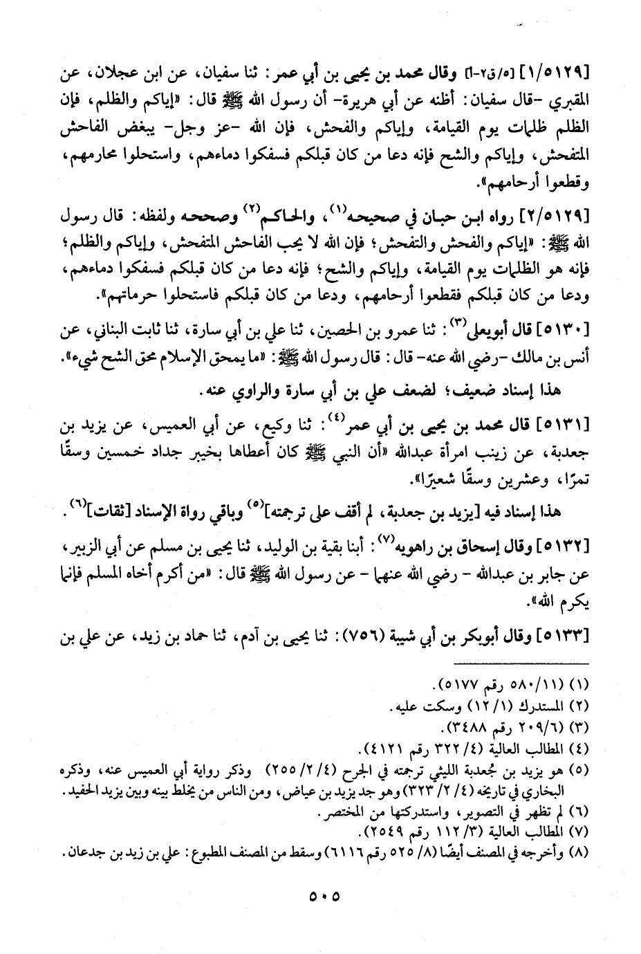 5129 / 2 - رَوَاهُ ابْنُ حِبَّانَ فِي صَحِيحِهِ، وَالْحَاكِمُ وَصَحَّحَهُ وَلَفْظُهُ: قَالَ رَسُولُ اللَّهِ - صَلَّى اللَّهُ عَلَيْهِ وَسَلَّمَ -: ((إِيَّاكُمْ وَالْفُحْشَ وَالتَّفَحُّشَ؟ فَإِنَّ اللَّهَ لَا يُحِبُّ الْفَاحِشَ الْمُتَفَحِّشَ، هاياكم والظلم؟ فإنه هو الظلمات يوم القيامة، هاياكم والشح؟ فإنه دعا من كان قبلكم فسفكوا دِمَاءَهُمْ، وَدَعَا مَنْ كَانَ قَبْلَكُمْ فَقَطَّعُوا أَرْحَامَهُمْ، وَدَعَا مَنْ كَانَ قَبْلَكُمْ فَاسْتَحَلُّوا حُرُمَاتِهِمْ ".
