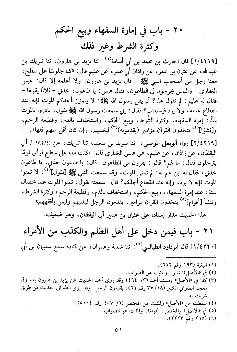4219 / 1 - قَالَ الْحَارِثُ بْنُ مُحَمَّدِ بْنِ أَبِي أُسَامَةَ: ثنا يزيد بن هارون، ثنا شَرِيكُ بْنُ عَبْدِ اللَّهِ، عَنْ عُثْمَانَ بْنِ عُمَرَ، عَنْ زَاذَانَ أَبِي عُمَرَ، عَنْ عُلَيْمٍ قَالَ: "كُنَّا جُلُوسًا عَلَى سَطْحٍ، مَعَنَا رَجُلٍ مِنْ أَصْحَابِ النَّبِيِّ - صَلَّى اللَّهُ عَلَيْهِ وَسَلَّمَ - قَالَ يَزِيدُ بْنُ هَارُونَ: وَلَا أَعْلَمُهُ إِلَّا قَالَ: عَبْسٌ الْغِفَارِيُّ- وَالنَّاسُ يَخْرُجُونَ فِي الطَّاعُونِ، فَقَالَ عَبْسٌ: يَا طَاعُونُ، خُذْنِي- ثَلَاثًا يَقُولُهَا- فَقَالَ لَهُ عُلَيْمٌ: لِمَ تَقُولُ هَذَا؟ أَلَمْ يَقُلْ رَسُولُ اللَّهِ - صَلَّى اللَّهُ عَلَيْهِ وَسَلَّمَ -: لَا يَتَمَنَّيَنَّ أَحَدُكُمُ الْمَوْتَ فَإِنَّهُ عِنْدَ انْقِطَاعِ عَمَلِهِ، وَلَا يُرَدُّ فَيَسْتَعْتِبُ؟ فَقَالَ: إِنِّي سَمِعْتُ رَسُولَ اللَّهِ - صَلَّى اللَّهُ عَلَيْهِ وسلم - يتكلول: بَادِرُوا بِالْمَوْتِ سِتًّا: إِمْرَةُ السُّفَهَاءِ، وَكَثْرَةُ الشُرط، وبيع الحكم، واستخفاف بالدم، وقطيعة الرحم، ونشوً يَتَّخِذُونَ الْقُرْآنَ مَزَامِيرَ (يُقَدِّمُونَهُ) لِيُغَنِّيَهُمْ، وَإِنْ كَانَ أَقَلَّ مِنْهُمْ فِقْهًا".