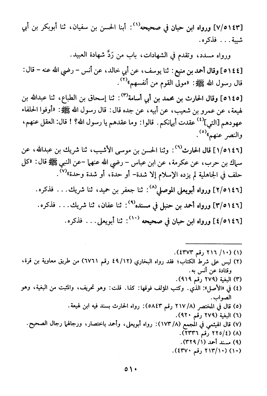 5145 - وَقَالَ الْحَارِثُ بْنُ مُحَمَّدِ بْنِ أَبِي أُسَامَةَ: ثَنَا إِسْحَاقُ بْنُ الطَّبَّاعِ، ثَنَا عَبْدُ اللَّهِ بْنُ لَهِيعَةَ، عَنْ عَمْرِو بْنِ شُعَيْبٍ، عَنْ أَبِيهِ، عَنْ جَدِّهِ قَالَ: قَالَ رَسُولُ اللَّهِ - صَلَّى اللَّهُ عَلَيْهِ وسلم -: ((أَوْفُوا الْحُلَفَاءَ عُهُودَهُمُ الَّتِي عَقَدَتْ أَيْمَانُكُمْ. قَالُوا: وَمَا عَقْدُهُمْ يَا رَسُولَ اللَّهِ؟! قَالَ: الْعَقْلُ عَنْهُمْ، وَالنَّصْرُ عَنْهُمْ".