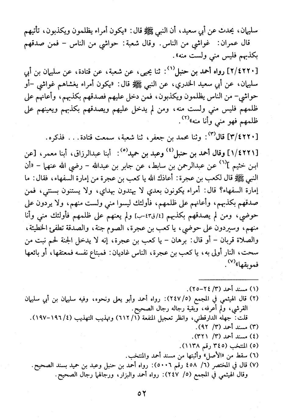 4221 / 1 - وَقَالَ أَحْمَدُ بْنُ حَنْبَلٍ وعبد بن حميد أبنا عبد الرزاق، أبنا معمر، عَنِ ابْنِ خُثَيْمٍ، عَنْ عَبْدِ الرَّحْمَنِ بْنِ سَابِطٍ، عَنْ جَابِرٍ بْنِ عَبْدِ اللَّهِ- رَضِيَ اللَّهُ عَنْهُمَا- "أَنَّ النَّبِيَّ - صَلَّى اللَّهُ عَلَيْهِ وَسَلَّمَ - قَالَ لِكَعْبِ بْنِ عُجْرَةَ: أَعَاذَكَ الله يا لكعب بْنَ عُجْرَةَ مِنْ إِمَارَةِ السُّفَهَاءِ، فَقَالَ: مَا إِمَارَةُ السُّفَهَاءِ؟ قَالَ: أُمَرَاءُ يَكُونُونَ بَعْدِي لَا يَهْتَدُونَ بِهُدَايَ، وَلَا يَسْتَنُّونَ بِسُنَّتِي، فَمَنْ صَدَّقَهُمْ بِكَذِبِهِمْ، وَأَعَانَهُمْ عَلَى ظُلْمِهِمْ، فَأُولَئِكَ لَيْسُوا مِنِّي وَلَسْتُ مِنْهُمْ، وَلَا يَرِدُونَ عَلَى حَوْضِي، وَمَنْ لَمْ يُصَدْقِهْمُ بِكَذِبِهِمْ وَلَمْ يُعِنْهُمْ عَلَى ظُلْمِهِمْ فَأُولَئِكَ مِنِّي وَأَنَا مِنْهُمْ، وَسَيَرِدُونَ عَلَى حَوْضِي، يَا كَعْبُ بْنَ عُجْرَةَ، الصُّومُ جُنَّةٌ، وَالصَّدَقَةُ تُطْفِئُ الْخَطِيئَةَ، وَالصَّلَاةُ قُرْبَانٌ- أَوْ قَالَ: بُرْهَانٌ- يَا كَعْبُ بْنَ عُجْرَةَ، إِنَّهُ لَا يَدْخُلِ الجنة لحم نبت من سحت، النار أَوْلَى بِهِ، يَا كَعْبُ بْنَ عُجْرَةَ، النَّاسُ غَادِيَانِ: فَمُبْتَاعٌ نَفْسَهُ فَمُعْتِقُهَا، أَوْ بَائِعُهَا فَمُوبِقُهَا".