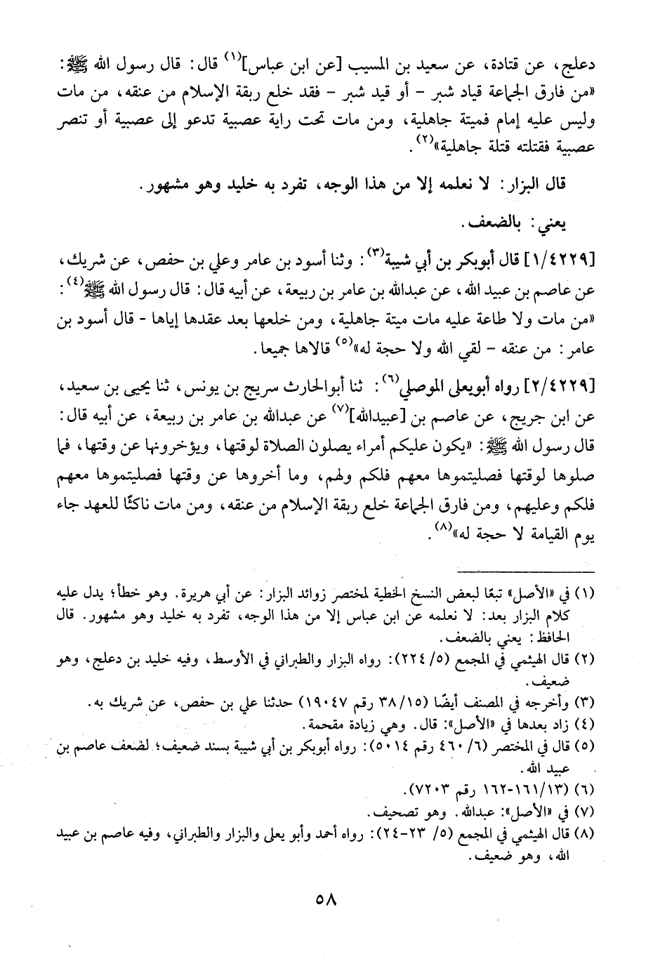 دَعْلَجٍ، عَنْ قَتَادَةَ، عَنْ سَعِيدِ بْنِ الْمُسَيِّبِ عَنْ ابن عبالس، قَالَ: قَالَ رَسُولُ اللَّهِ - صَلَّى اللَّهُ عَلَيْهِ وسلم - أو: "من فارق الجماعة قياد شسبر- أو قيد شهب- فقد خلع ربقة الإسلام من عنقه، من مَاتَ وَلَيْسَ عَلَيْهِ إِمَامٌ فَمِيتَةٌ جَاهِلِيَّةٌ، وَمَنْ مَاتَ تَحْتَ رَايَةٍ عَصَبِيَّةً تَدْعُو إِلَى عَصَبِيَّةٍ أو تنصر عصبية فقتلته قتلة جاهلجة".
