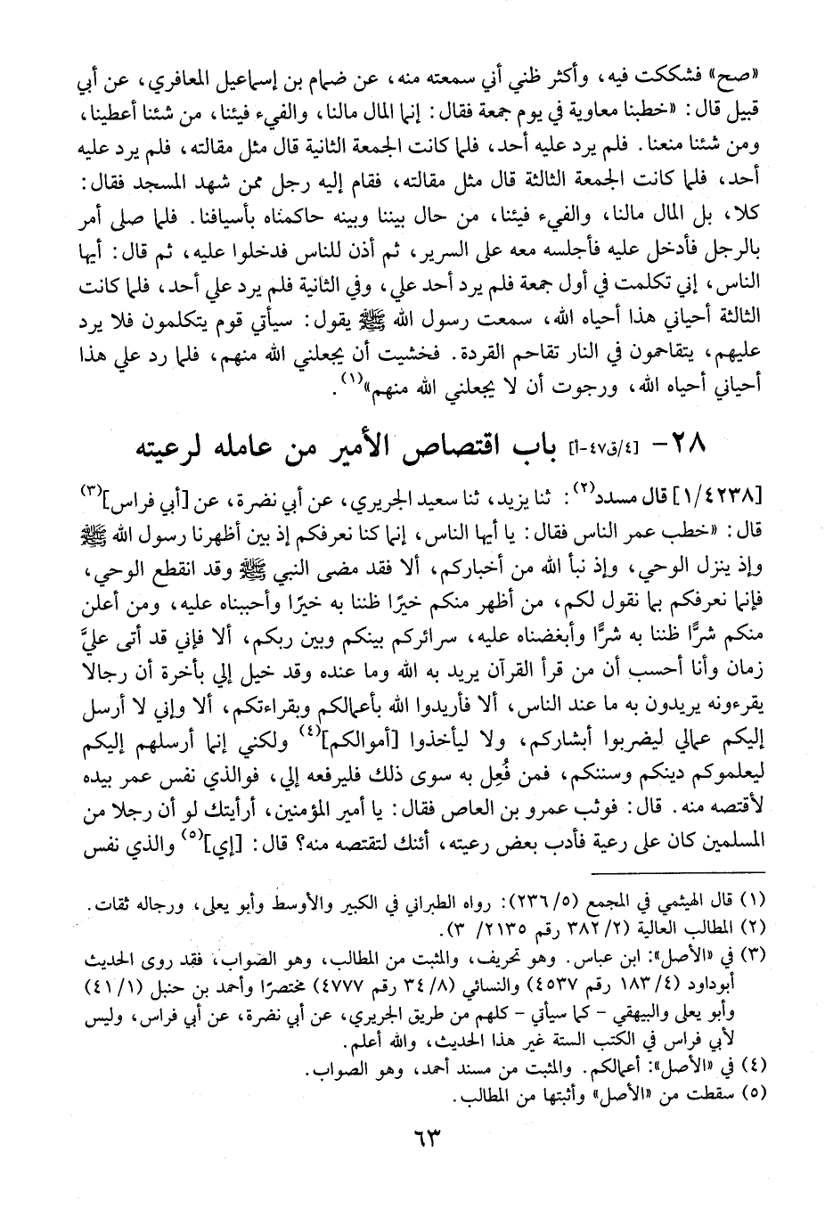 4238 / 1 - قَالَ مُسَدَّدٌ: ثنا يَزِيدُ، ثنا سَعِيدٌ الْجَرِيرِيُّ، عَنْ أَبِي نصْرة، عن أبي فراس قَالَ: "خَطَبَ عُمَرُ النَّاسَ فَقَالَ: يَا أَيُّهَا النَّاسُ، إِنَّمَا كُنَّا نَعْرِفُكُمْ إِذْ بَيْنَ أَظْهُرِنَا رَسُولُ اللَّهُ - صَلَّى اللَّهُ عَلَيْهِ وَسَلَّمَ - وَإِذْ يَنْزِلُ الْوَحْيُ، وَإِذْ نَبَّأَ اللَّهُ مِنْ أَخْبَارِكُمْ، أَلَا فَقَدْ مَضَى النَّبِيُّ - صَلَّى اللَّهُ عَلَيْهِ وَسَلَّمَ - وَقَدِ انْقَطَعَ الْوَحْيُ، فَإِنَّمَا نَعْرِفُكُمْ بِمَا نَقُولُ لَكُمْ، مَنْ أَظْهَرَ مِنْكُمْ خَيْرًا ظَنَنَّا بِهِ خَيْرًا وَأَحْبَبْنَاهُ عَلَيْهِ، وَمَنْ أَعْلَنَ مِنْكُمْ شَرًّا ظَنَنَّا بِهِ شَرًّا وَأَبْغَضْنَاهُ عَلَيْهِ، سَرَائِرُكُمْ بَيْنَكُمْ وَبَيْنَ رَبِّكُمْ، أَلَا فَإِنِّي قَدْ أَتَى عليَّ زَمَانٌ وَأَنَا أَحْسَبُ أَنْ مَنْ قَرَأَ الْقُرْآنَ يُرِيدُ بِهِ اللَّهَ وَمَا عِنْدَهُ وَقَدْ خييل إِلَيَّ بِآخِرِهِ أَنَّ رِجَالًا يَقْرءونَهُ يُرِيدُونَ بِهِ مَا عِنْدَ النَّاسِ، أَلَا فَأُرِيدُوا اللَّهَ بِأَعْمَالِكُمْ وبقراءتكم، أَلَا وَإِنِّي لَا أُرْسِلُ إِلَيْكُمْ عُمَّالِي لِيَضْرِبُوا أبشاركم، ولا ليأخذوا أموالكم، وَلَكِنِّي إِنَّمَا أُرْسِلُهُمْ إِلَيْكُمْ لِيُعَلِّمُوكُمْ دِينَكُمْ وَسُنَنَكُمْ، فَمَنْ فُعِل بِهِ سِوَى ذَلِكَ فَلْيَرْفَعْهُ إِلَيَّ، فَوَالَّذِي نَفْسُ عُمَرَ بِيَدِهِ لَأَقْتَصَّهُ مِنْهُ. قَالَ: فَوَثَبَ عَمْرُو بْنُ الْعَاصِ فَقَالَ: يَا أَمِيرَ الْمُؤْمِنِينَ، أَرَأَيْتَكَ لَوْ أَنَّ رَجُلًا مِنَ الْمُسْلِمِينَ كان على رعية فأدب بعض رعيته، أئنك لتقتصه منه؟ قال: إي وَالَّذِي نَفْسُ عُمَرَ بِيَدِهِ، وَكَيْفَ لَا أَقْتَصُّ مِنْهُ وَقَدْ رَأَيْتُ رَسُولَ اللَّهِ - صَلَّى اللَّهُ عَلَيْهِ وَسَلَّمَ - يَقْتَصُّ مِنْ نَفْسِهِ، أَلَا لَا تَضْرِبُوا الْمُسْلِمِينَ فَتُذِلُّوهُمْ، وَلَا تَمْنَعُوهُمْ حُقَوقَهُمْ فَتُكَفِّرُوهُمْ، وَلَا تُجْمِرُوهُمْ فتفتنوهم، ولا تنزلوهم الغياض فتضيعوهم ".