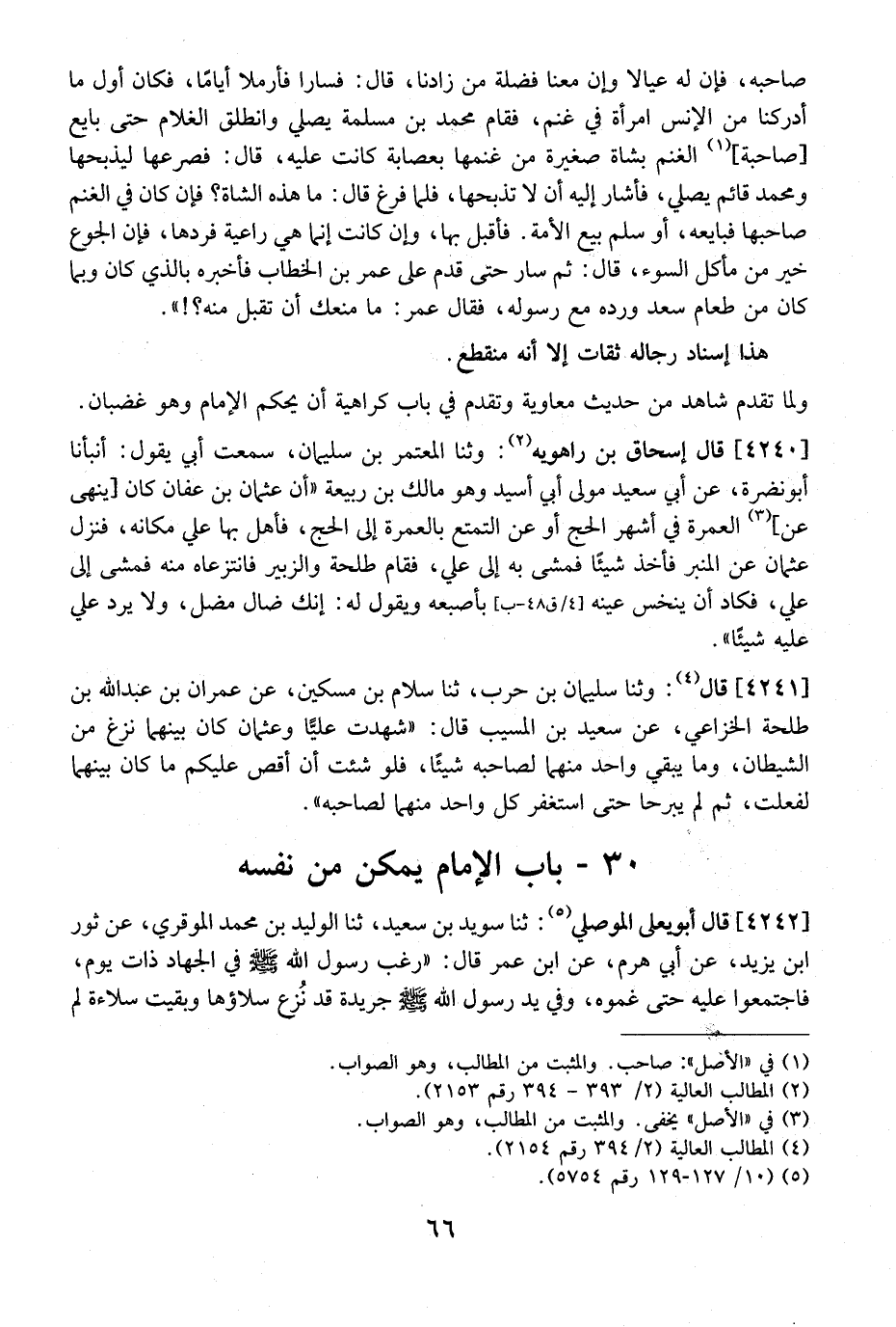 4240 - قَالَ إِسْحَاقُ بْنُ رَاهَوَيْهِ: وَثنا الْمُعْتَمِرُ بْنُ سُلَيْمَانَ، سَمِعْتُ أَبِي يَقُولُ: أنبأنا أَبُو نَضْرَةَ، عَنْ أَبِي سَعِيدٍ مَوْلَى أَبِي أُسَيْدٍ وَهُوَ مَالِكُ بْنُ رَبِيعَةَ "أَنَّ عُثْمَانَ بْنَ عَفَّانَ كَانَ يَنْهَى عَنِ العمرة ما أَشْهُرِ الْحَجِّ أَوْ عَنِ التَّمَتُّعِ بِالْعُمْرَةِ إِلَى الْحَجِّ، فَأَهَلَّ بِهَا عَلَى مَكَانِهِ، فَنَزَلَ عُثْمَانُ عَنِ الْمِنْبَرِ فَأَخَذَ شَيْئًا فَمَشَى بِهِ إِلَى عَلِيٍّ، فَقَامَ طَلْحَةُ وَالزُّبَيْرُ فَانْتَزَعَاهُ مِنْهُ فَمَشَى إِلَى عَلِيٍّ، فَكَادَ أَنْ يَنْخُسَ عَيْنَهُ بِإِصْبُعِهِ وَيَقُولُ لَهُ: إِنَّكَ ضَالٌّ مُضِلٌّ، وَلَا يَرُدُّ علي عليه شميئًا".