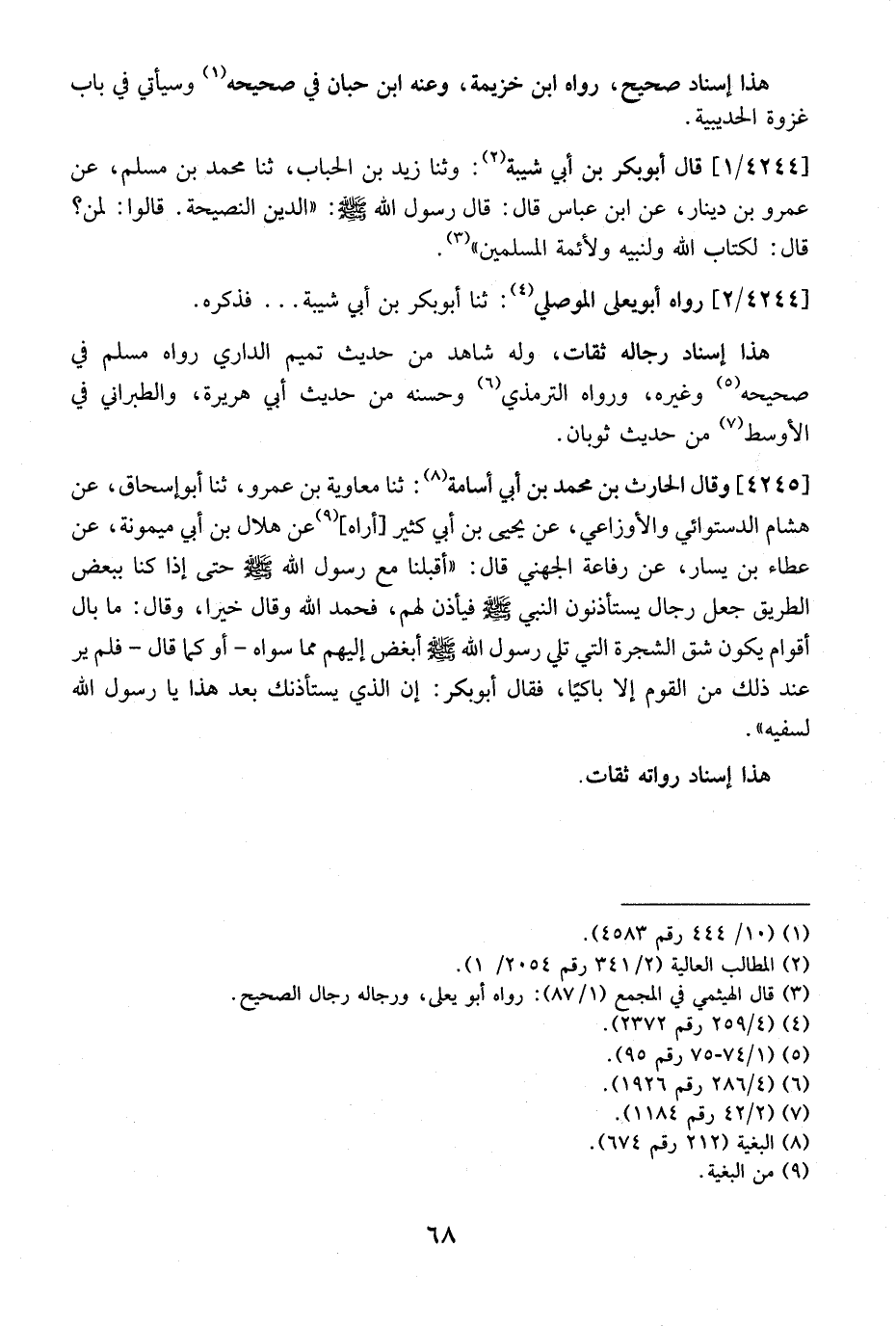 4244 / 1 - قَالَ أَبُو بَكْرِ بْنُ أَبِي شَيْبَةَ: وَثَنَا زَيْدُ بْنُ الْحُبَابِ، ثنا مُحَمَّدُ بْنُ مُسْلِمٍ، عَنْ عَمْرِو بْنِ دِينَارٍ، عَنِ ابْنِ عَبَّاسٍ قَالَ: قَالَ رَسُولُ اللَّهِ - صَلَّى اللَّهُ عَلَيْهِ وَسَلَّمَ -: ((الدِّينُ النَّصِيحَةُ. قَالُوا: لِمَنْ؟ قَالَ: لِكِتَابِ اللَّهِ وَلِنَبِيِّهِ وَلِأَئِمَّةِ الْمُسْلِمِينَ ".