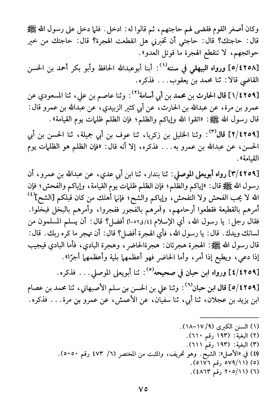 4259 / 3 - رَوَاهُ أَبُو يَعْلَى الْمَوْصِلِيُّ: ثَنَا بِنْدَارٌ، ثَنَا ابن أبي عدي، عن عبد الله بن عمرو، أن رسوله اللَّهِ - صَلَّى اللَّهُ عَلَيْهِ وَسَلَّمَ - قَالَ: "إِيَّاكُمْ وَالظُّلْمَ؟ فَإِنَّ الظُّلْمَ ظُلُمَاتٌ يَوْمَ الْقِيَامَةِ، وَإِيَّاكُمْ وَالْفُحْشَ؟ فَإِنَّ اللَّهَ لَا يُحِبُّ الْفُحْشَ وَلَا التَّفَحُّشَ، وَإِيَّاكُمْ وَالشُّحَّ، فَإِنَّمَا أَهْلَكَ مَنْ كَانَ قبلكم الشح، أمرهم بالقطيعة فقطعوا أرحامهم، وأمرهم بِالْفُجُورِ فَفَجَرُوا، وَأَمَرَهُمْ بِالْبُخْلِ فَبَخِلُوا. فَقَالَ رَجُلٌ: يَا رَسُولَ اللَّهِ - صَلَّى اللَّهُ عَلَيْهِ وَسَلَّمَ -، أَيُّ الْإِسْلَامِ أَفْضَلُ؟ قَالَ: أَنْ يَسْلَمَ الْمُسْلِمُونَ من لسانك ويدك. قالت: يَا رَسُولَ اللَّهِ - صَلَّى اللَّهُ عَلَيْهِ وَسَلَّمَ -، فَأَيُّ الْهِجْرَةِ أَفْضَلُ؟ قَالَ: أَنْ تَهْجُرَ مَا كره ربك. قَالَتْ: قَالَ رَسُولُ اللَّهِ - صَلَّى اللَّهُ عَلَيْهِ وَسَلَّمَ -: الْهِجْرَةُ هِجْرَتَانِ: هِجْرَةُ الْحَاضِرِ، وَهِجْرَةُ الْبَادِي، فَأَمَّا الْبَادِي فَيُجِيبُ إِذَا دُعِيَ، وَيُطِيعُ إِذَا أُمِرَ، وَأَمَّا الْحَاضِرُ فَهُوَ أَعْظَمُهُمَا بَلِيَّةً وَأَعْظَمُهُمَا أَجْرًا".