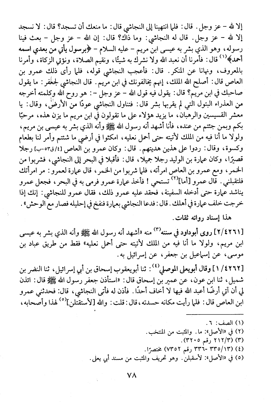 إِلَّا لِلَّهِ- عَزَّ وَجَلَّ. قَالَ: فَلَمَّا انْتَهَيْنَا إِلَى النَّجَاشِيِّ قَالَ: مَا مَنَعَكَ أَنْ تَسْجُدَ؟ قَالَ: لَا نَسْجُدَ إِلَّا لِلَّهِ- عَزَّ وَجَلَّ. قَالَ لَهُ النَّجَاشِيُّ: وَمَا ذَاكَ؟ قَالَ: إِنَّ اللَّهَ- عَزَّ وَجَلَّ- بَعَثَ فِينَا رَسُولَهُ، وَهُوَ الذي بشر به عيسى ابن مريم- عليه السلام-[برسول يأتي من بعدي اسْمُهُ أَحْمَدُ] ، قَالَ: فَأَمَرَنَا أَنْ نَعْبُدَ اللَّهَ وَلَا نُشْرِكَ بِهِ شَيْئًا، وَنُقِيمَ الصَّلَاةَ، وَنُؤْتِيَ الزَّكَاةَ، وَأَمَرَنَا بِالْمَعْرُوفِ، وَنَهَانَا عَنِ الْمُنْكَرِ. قَالَ: فَأَعْجَبَ النَّجَاشِيَّ قَوْلُهُ، فَلَمَّا رَأَى ذَلِكَ عَمْرُو بن العاص قالت: أَصْلَحَ اللَّهُ الْمَلِكَ، إِنَّهُمْ يُخَالِفُونَكَ فِي ابْنِ مَرْيَمَ. قَالَ النَّجَاشِيُّ لِجَعْفَرٍ: مَا يَقُولُ صَاحِبُكَ فِي ابْنِ مَرْيَمَ؟ قَالَ: يَقُولُ فِيهِ قَوْلَ اللَّهِ- عَزّ وَجَلَّ-: هُوَ رَوْحُ اللَّهِ وَكَلِمَتُهُ أَخْرَجَهُ مِنَ الْعَذْرَاءِ الْبَتُولِ الَّتِي لَمْ يَقْرَبْهَا بَشَرٌ قَالَ: فَتَنَاوَلَ النَّجَاشِيُّ عُودًا مِنَ الْأَرْضِ، وَقَالَ: يَا مَعْشَرَ الْقِسِّيسِينَ وَالرُّهْبَانَ، مَا يَزِيدُ هؤلاء على ما تقولون فِي ابْنِ مَرْيَمَ مَا يَزِنُ هَذِهِ، مَرْحبًا بِكُمْ وَبِمَنْ جِئْتُمْ مِنْ عِنْدِهِ، فَأَنَا أَشْهَدُ أَنَّهُ رَسُولُ اللَّهِ - صَلَّى اللَّهُ عَلَيْهِ وَسَلَّمَ - وإنه الذي بشر به عيسى بن مريم، وَلَوْلَا مَا أَنَا فِيهِ مِنَ الْمُلْكِ لَأَتَيْتُهُ حَتَّى أَحْمِلَ نَعْلَيْهِ، امْكُثُوا فِي أَرْضِي مَا شِئْتُمْ وَأَمَرَ لَنَا بِطَعَامٍ وَكِسْوَةٍ، وَقَالَ: رُدُّوا على هذين هَدِيَّتَهُمْ. قَالَ: وَكَانَ عَمْرُو بْنُ الْعَاصِ، رَجُلًا قَصِيرًا، وَكَانَ عُمَارَةُ بْنُ الْوَلِيدِ رَجُلًا جَمِيلًا، قَالَ: فَأَقْبَلَا فِي الْبَحْرِ إِلَى النَّجَاشِيِّ، فَشَرِبُوا مِنَ الْخَمْرِ، وَمَعَ عَمْرِو بْنِ الْعَاصِ امْرَأَتُهُ، فَلَمَّا شَرِبُوا مِنَ الْخَمْرِ، قَالَ عُمَارَةُ لِعَمْرٍو: مر امرأتك فلتقبلني. قال عمرو أما، تستحي فأخذ عمارة عمرو فَرَمَى بِهِ فِي الْبَحْرِ، فَجَعَلَ عَمْرُو يُنَاشِدُ عُمَارَةَ حَتَّى أَدْخَلَهُ السَّفِينَةَ، فَحَقَدَ عَلَيْهِ عَمْرٌو ذَلِكَ، فَقَالَ عَمْرٌو لِلنَّجَاشِيِّ: إِنَّكَ إِذَا خَرَجْتَ خَلَفَ عُمَارَةُ فِي أَهْلِكَ. قَالَ: فَدَعَا النَّجَاشِيُّ بِعُمَارَةَ فَنَفَخَ فِي إِحْلِيلِهِ فَصَارَ مَعَ الْوَحْشِ". هَذَا إِسْنَادٌ رِوَاتُهُ ثِقَاتٌ.