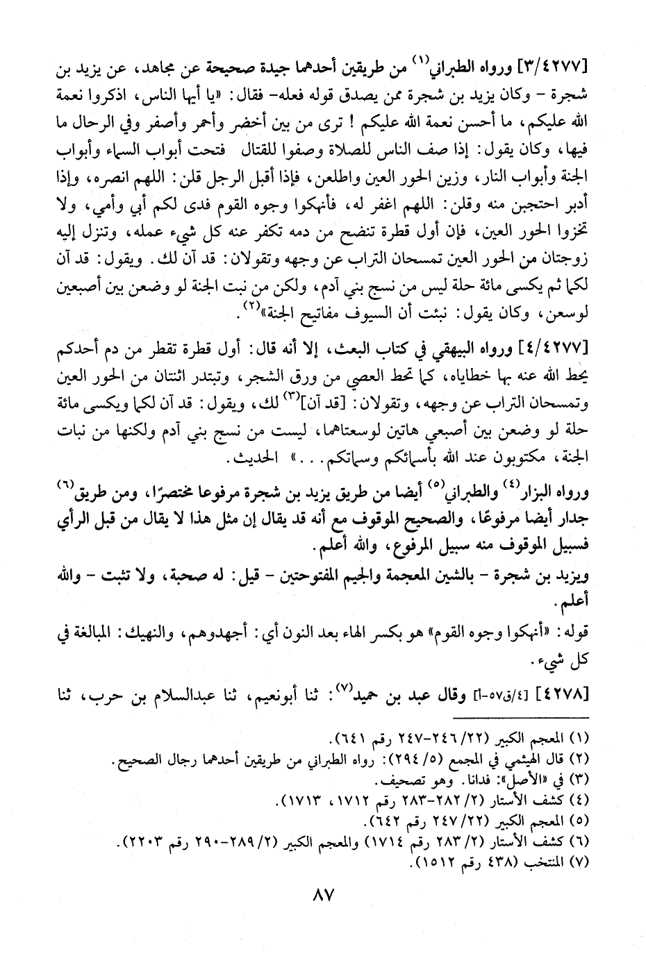 4277 / 3 - وَرَوَاهُ الطَّبَرَانِيُّ مِنْ طَرِيقَيْنِ أَحَدُهُمَا جَيِّدَةٌ صَحِيحَةٌ عَنْ مُجَاهِدٍ، عَنْ يَزِيدَ بْنِ شَجَرَةَ- وَكَانَ يَزِيدُ بْنُ شَجَرَةَ مِمَّنْ يَصْدُقُ قَوْلُهُ فِعْلَهُ- فَقَالَ: "يَا أَيُّهَا النَّاسُ، اذْكُرُوا نِعْمَةَ اللَّهِ عَلَيْكُمْ، مَا أَحْسَنَ نِعْمَةَ اللَّهِ عَلَيْكُمْ! تُرَى مِنْ بَيْنِ أَخْضَرَ وَأَحْمَرَ وَأَصْفَرَ وَفِي الرِّحَالِ ما فيها، وكان يَقُولُ: إِذَا صُفَّ النَّاسُ لِلصَّلَاةِ وَصُفُّوا لِلْقِتَالِ فتحت أبو اب السماء وأبو اب الجنة وأبو اب النَّارِ، وَزُيِّنَ الْحُورُ الْعِينُ وَاطَّلَعْنَ، فَإِذَا أَقْبَلَ الرجل قلن: اللهم انصره، هذا أَدْبَرَ احْتَجَبْنَ مِنْهُ وَقُلْنَ: اللَّهُمَّ اغْفِرْ لَهُ، فأنهكوا وُجُوهَ الْقَوْمِ فِدًى لَكُمْ أَبِي وَأُمِّي، وَلَا تخزوا الْحُورَ الْعِينَ، فَإِنَّ أَوَّلَ قَطْرَةٍ تَنْضَحُ مِنْ دمه تكفر عنه كل شيء عمله، وتنزلق إليه زوجتان من الحور العين تمسحان التراب عن وجهه وتقولان: قد آن لك. ويقوله: قَدْ آنَ لَكُمَا ثُمَّ يُكْسَى مِائَةَ حُلَّةً ليس من نسج بني آدم، ولكن من نبت الجنة لَوْ وُضِعْنَ بَيْنَ أَصْبُعَيْنِ لَوَسِعْنَ، وَكَانَ يَقُولُ: نُبِّئْتُ أَنَّ السُّيوفَ مَفَاتِيحُ الْجَنَّةِ".