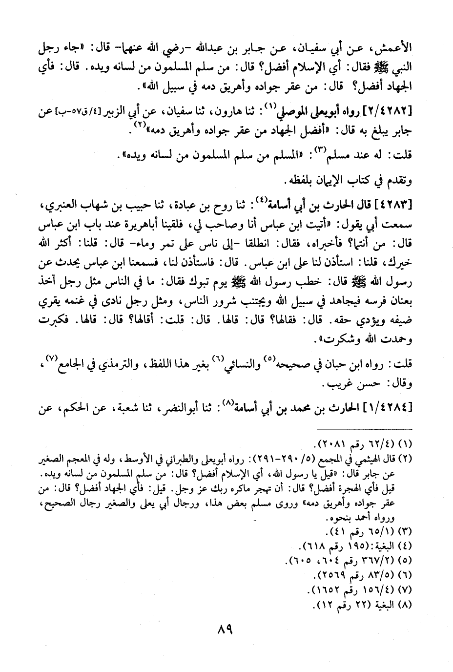 الْأَعْمَشِ، عَنْ أَبِي سُفْيَانَ، عَنْ جَابِرِ بْنِ عَبْدِ اللَّهِ- رَضِيَ اللَّهُ عنهما- قال: "جاء رَجُلٌ النَّبِيِّ - صَلَّى اللَّهُ عَلَيْهِ وَسَلَّمَ - فَقَالَ: أَيُّ الْإِسْلَامِ أَفْضَلُ؟ قَالَ: مَنْ سَلِمَ الْمُسْلِمُونَ مِنْ لسانه ويده. قَالَ: فَأَيُّ الْجِهَادِ أَفْضَلُ؟ قَالَ: مَنْ عُقِرَ جَوَادَهُ وَأُهْرِيقَ دَمُهُ فِي سَبِيلِ اللَّهِ ".