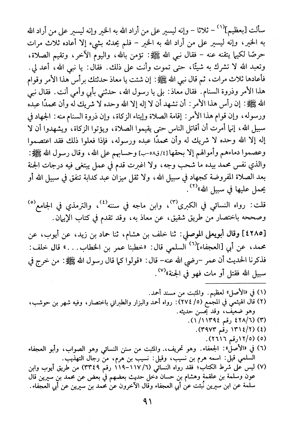 سألت بعظيم، - ثلاثا- إنه لَيَسِيرٌ عَلَى مَنْ أَرَادَ اللَّهُ بِهِ الْخَيْرَ وَإِنَّهُ لَيَسِيرٌ عَلَى مَنْ أَرَادَ اللَّهُ بِهِ الْخَيْرَ، وَإِنَّهُ لَيَسِيرٌ عَلَى مَنْ أَرَادَ اللَّهُ بِهِ الْخَيْرَ- فَلَمْ يُحَدِّثْهُ بِشَيْءٍ إِلَّا أَعَادَهُ ثَلَاثَ مَرَّاتٍ حِرْصًا لَكَيْمَا يُتْقِنَهُ عَنْهُ- فَقَالَ نَبِيُّ اللَّهِ - صَلَّى اللَّهُ عَلَيْهِ وَسَلَّمَ -: تُؤْمِنُ بِاللَّهِ، وَالْيَوْمِ الاَخر، وَتُقِيمُ الصَّلَاةَ، وَتَعْبُدُ اللَّهَ لَا تُشْرِكُ بِهِ شَيْئًا، حَتَّى تَمُوتَ وَأَنْتَ عَلَى ذَلِكَ. فَقَالَ: يَا نَبِيَّ اللَّهِ، أَعِدْ لي. فأعادها ثلاث مرات، ثم قَالَ نَبِيُّ اللَّهِ- صَلَّى اللَّهُ عَلَيْهِ وَسَلَّمَ -: إِنَ شِئْتَ يَا مُعَاذُ حَدَّثْتُكَ بِرَأْسِ هَذَا الْأَمْرِ وَقُوَامِ هَذَا الْأَمْرِ وَذُرْوَةِ السِّنَامِ. فَقَالَ معاذ: بلى يارسول اللَّهِ، حَدَّثَنِي بِأَبِي وَأُمِّي أَنْتَ. فَقَالَ نَبِيُّ اللَّهِ - صَلَّى اللَّهُ عَلَيْهِ وَسَلَّمَ -: إِنَّ رَأْسَ هذا الأمر: أَنْ تَشْهَدَ أَنْ لَا إِلَهَ إِلَّا اللَّهُ وَحْدَهُ لَا شَرِيكَ لَهُ وأن محمدًا عبد هـ وَرَسُولُهُ، وَإِنَّ قُوَامَ هَذَا الْأَمْرِ: إِقَامَةُ الصَّلَاةِ وَإِيتَاءُ الزَّكَاةِ، وَإِنَّ ذُرْوَةَ السِّنَامِ مِنْهُ: الْجِهَادُ فِي سَبِيلِ اللَّهِ، إِنَّمَا أُمِرْتُ أَنْ أُقَاتِلَ النَّاسَ حَتَّى يُقِيمُوا الصَّلَاةَ، وَيُؤْتُوا الزَّكَاةَ، وَيَشْهَدُوا أَنْ لَا إِلَهَ إِلَّا اللَّهُ وَحْدَهُ لَا شَرِيكَ لَهُ وأن محمدًا عبد هـ وَرَسُولُهُ، فَإِذَا فَعَلُوا ذَلِكَ فَقَدِ اعْتَصَمُوا وَعَصَمُوا دِمَاءَهُمْ وَأَمْوَالَهُمْ إِلَّا بِحَقِّهَا، وَحِسَابُهُمْ عَلَى اللَّهِ، وَقَالَ رَسُولُ اللَّهِ - صَلَّى اللَّهُ عَلَيْهِ وَسَلَّمَ - وَالَّذِي نَفْسُ مُحَمَّدٍ بِيَدِهِ مَا شَحَبَ وَجْهٌ، وَلَا اغْبَرَّتْ قَدَمٌ فِي عَمَلٍ يُبْتَغَي فِيهِ دَرَجَاتُ الْجَنَّةِ بَعْدَ الصَّلَاةِ الْمَفْرُوضَةِ كَجِهَادٍ فِي سبيل الله، ولا ثقل ميزان عبد كدابة تُنْفَقُ فِي سَبِيلِ اللَّهِ أَوْ يُحْمَلُ عَلَيْهَا فِي سَبِيلِ اللَّهِ ".