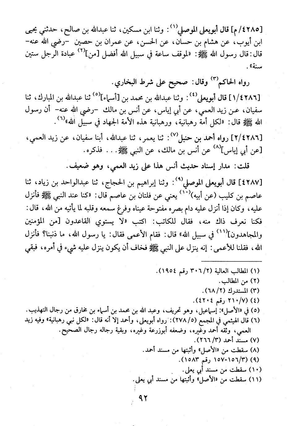 [4285/م] قَالَ أَبُو يَعْلَى الْمَوْصِلِيُّ: وثنا ابْنُ مِسْكِينٍ، ثنا عَبْدُ اللَّهِ بْنُ صَالِحٍ، حَدَّثَنِي يَحْيَى ابن أَيُّوبَ، عَنْ هِشَامِ بْنِ حَسَّانٍ، عَنِ الْحَسَنِ، عَنْ عِمْرَانَ بْنِ حُصَيْنٍ- رَضِيَ اللَّهُ عَنْهُ- قَالَ: قَالَ رَسُولُ اللَّهِ - صَلَّى اللَّهُ عَلَيْهِ وَسَلَّمَ -: لَمَوْقِفٌ سَاعَةً فِي سَبِيلِ اللَّهِ أَفْضَلُ مِنْ، عِبَادَةِ الرَّجُلِ سِتِّينَ سَنَةً".