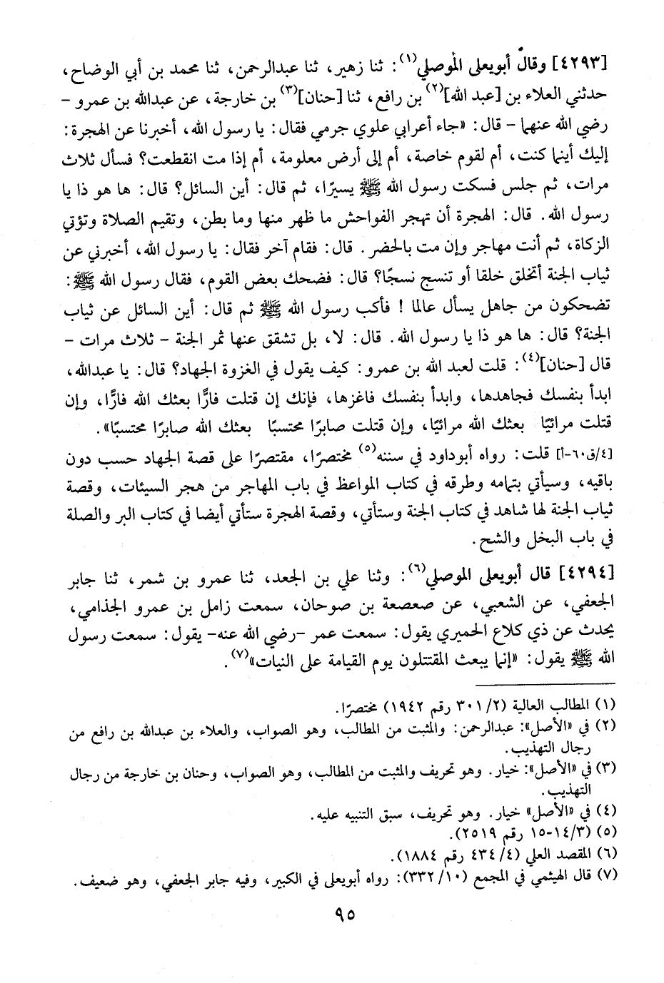 4293 - وَقَالَ أَبُو يَعْلَى الْمَوْصِلِيُّ: ثَنَا زُهَيْرٌ، ثَنَا عَبْدُ الرَّحْمَنِ، ثنا مُحَمَّدُ بْنُ أَبِي الْوَضَّاحِ، حدثني العلاء بن عبد الله، بن رافع، ثنا حنان، بْنُ خَارِجَةَ، عَنْ عَبْدِ اللَّهِ بْنِ عَمْرٍو- رَضِيَ اللَّهُ عنهما- قالت: "جَاءَ أَعْرَابِيٌّ عَلَوِيٌّ جَرْمِيٌّ فَقَالَ: يَا رَسُولَ اللَّهِ، أَخْبِرْنَا عَنِ الْهِجْرَةِ: إِلَيْكَ أَيْنَمَا كُنْتَ، أَمْ لِقَوْمٍ خَاصَّةً، أَمْ إِلَى أَرْضٍ مَعْلُومَةٍ، أَمْ إِذَا مِتَّ انْقَطَعَتْ؟ فَسَأَلَ ثَلَاثَ مَرَّاتٍ، ثُمَّ جَلَسَ فَسَكَتَ رَسُولُ اللَّهِ - صَلَّى اللَّهُ عَلَيْهِ وَسَلَّمَ - يَسِيرًا، ثُمَّ قَالَ: أَيْنَ السَّائِلُ؟ قَالَ: هَا هُوَ ذَا يَا رَسُولَ اللَّهِ. قَالَ: الْهِجْرَةُ أَنْ تَهْجُرَ الْفَوَاحِشَ مَا ظَهَرَ مِنْهَا وَمَا بَطَنَ، وَتُقِيمَ الصَّلَاةَ وَتُؤْتِي الزَّكَاةَ، ثُمَّ أَنْتَ مُهَاجِرٌ وَإِنْ مِتَّ بِالْحَضَرِ. قَالَ: فَقَامَ آخَرُ فَقَالَ: يَا رَسُولَ اللَّهِ، أَخْبِرْنِي عَنْ ثِيَابِ الْجَنَّةِ أَتُخْلَقُ خَلْقًا أَوْ تُنْسَجُ نَسْجًا؟ قَالَ: فَضَحِكَ بَعْضُ الْقَوْمُ، فَقَالَ رَسُولُ اللَّهِ - صَلَّى اللَّهُ عَلَيْهِ وَسَلَّمَ -: تَضْحَكُونَ مِنْ جَاهِلٍ يَسْأَلُ عَالِمًا! فَأَكَبَّ رَسُولُ اللَّهِ - صَلَّى اللَّهُ عَلَيْهِ وَسَلَّمَ - ثُمَّ قَالَ: أَيْنَ السَّائِلُ عَنْ ثِيَابِ الْجَنَّةِ؟ قَالَ: هَا هُوَ ذَا يا رسوله الله. قالت: لَا، بَلْ تَشَقَّقُ عَنْهَا ثَمَرُ الْجَنَّةِ- ثَلَاثَ مرات- قال حنان،: قُلْتُ لِعَبْدِ اللَّهِ بْنِ عَمْرٍو: كَيْفَ يَقُولُ في الغزوة الجهاد؟ قَالَ: يَا عَبْدُ اللَّهِ، ابْدَأْ بِنَفْسِكَ فَجَاهِدْهَا، وابدأ بنفسك فاغزها، فَإِنَّكَ إِنْ قُتِلْتَ فَارًّا بَعَثَكَ اللَّهُ فَارًّا، وإن قاتلت مُرَائِيًّا بَعَثَكَ اللَّهُ مُرَائِيًّا، وَإِنْ قُتِلْتَ صَابِرًا مُحْتَسِبًا بَعَثَكَ اللَّهُ صَابِرًا مُحْتَسِبًا". قُلْتُ: رَوَاهُ أبو داود في سننه النبي - صلى الله عليه وسلم - مختصرًا، مقتصرًا على قصة الجهاد حسب دُونَ بَاقِيهِ، وَسَيْأَتِي بِتَمَامِهِ وَطُرُقِهِ فِي كِتَابِ الْمَوَاعِظِ فِي بَابِ الْمُهَاجِرُ مَنْ هَجَرَ السَّيِّئَاتِ، وَقِصَّةُ ثِيَابِ الْجَنَّةِ لَهَا شَاهِدٌ فِي كِتَابِ الجنة وستأتي، وَقِصَّةُ الْهِجْرَةِ سَتَأْتِي أَيْضًا فِي كِتَابِ الْبِرِّ وَالصِّلَةِ فِي بَابِ الْبُخْلِ وَالشُّحِّ.