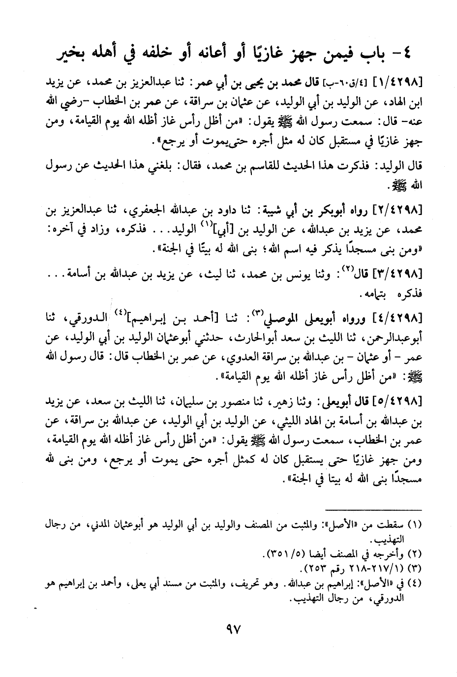 4298 / 1 - قَالَ مُحَمَّدُ بْنُ يَحْيَى بْنِ أَبِي عُمَرَ: ثنا عَبْدُ الْعَزِيزِ بْنُ مُحَمَّدٍ، عَنْ يَزِيدَ ابن الْهَادِ، عَنِ الْوَلِيدِ بْنِ أَبِي الْوَلِيدِ، عَنْ عُثْمَانَ بْنِ سُرَاقَةَ، عَنْ عُمَرَ بْنِ الْخَطَّابِ- رَضِيَ اللَّهُ عَنْهُ- قَالَ: سَمِعْتُ رَسُولَ اللَّهِ - صَلَّى اللَّهُ عَلَيْهِ وَسَلَّمَ - يَقُولُ: "مَنْ أَظَلَّ رَأْسَ غَازٍ أَظَلَّهُ اللَّهُ يَوْمَ الْقِيَامَةِ، وَمَنْ جهز غازيًا في مستقبل كَانَ لَهُ مِثْلُ أَجْرِهِ حَتَّى يَمُوتَ أَوْ يَرْجِعَ ".