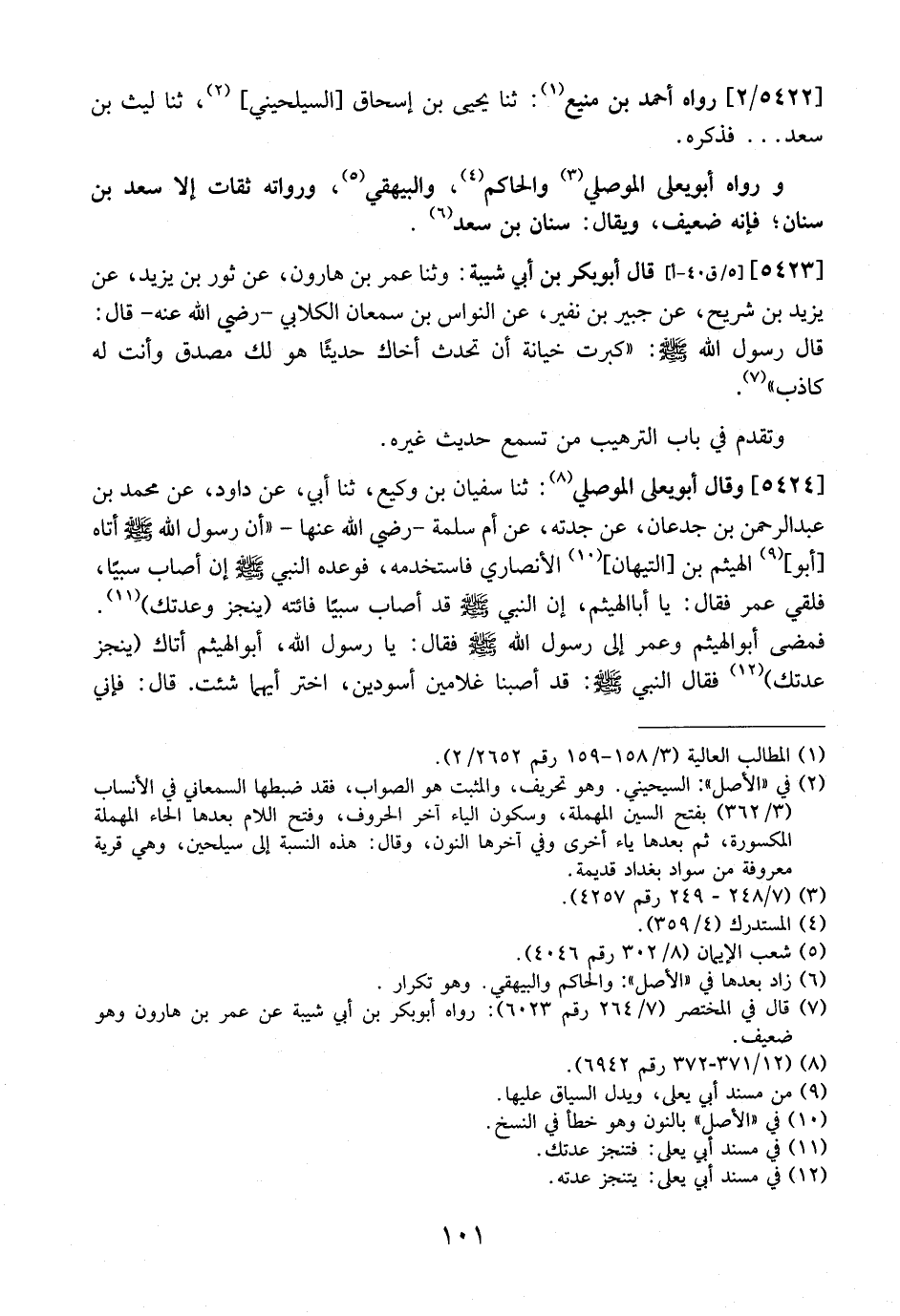 5424 - وَقَالَ أَبُو يَعْلَى الْمَوْصِلِيُّ: ثَنَا سُفْيَانُ بْنُ وَكِيعٍ، ثَنَا أَبِي، عَنْ دَاوُدَ، عَنْ مُحَمَّدِ بْنِ عَبْدِ الرَّحْمَنِ بْنِ جُدْعَانَ، عَنْ جَدَّتِهِ، عَنْ أُمِّ سَلَمَةَ- رَضِيَ اللَّهُ عَنْهَا- "أَنَّ رَسُولَ اللَّهِ - صَلَّى اللَّهُ عَلَيْهِ وَسَلَّمَ - أَتَاهُ أبو الْهَيْثَمُ بْنُ التَّيْهَانِ، الْأَنْصَارِيُّ فَاسْتَخْدَمَهُ، فَوَعَدَهُ النَّبِيُّ - صَلَّى اللَّهُ عَلَيْهِ وَسَلَّمَ - إِنْ أَصَابَ سَبْيًا، فَلَقِيَ عُمَرَ فَقَالَ: يَا أَبَا الْهَيْثَمِ، إِنَّ النَّبِيَّ - صَلَّى اللَّهُ عَلَيْهِ وَسَلَّمَ - قَدْ أَصَابَ سبياً فائته يُنْجِزْ وِعْدَتَكَ. فَمَضَى أَبُو الْهَيْثَمِ وَعُمَرُ إِلَى رَسُولِ اللَّهِ - صَلَّى اللَّهُ عَلَيْهِ وَسَلَّمَ - فقال: يا رسول الله، أبو الهيثم أتاك (ينجز عدتك) فَقَالَ النَّبِيُّ - صَلَّى اللَّهُ عَلَيْهِ وَسَلَّمَ -: قَدْ أَصَبْنَا غُلَامَيْنِ أَسْوَدَيْنِ، اخْتَرْ أَيُّهُمَا شِئْتَ. قَالَ: فَإِنِّي