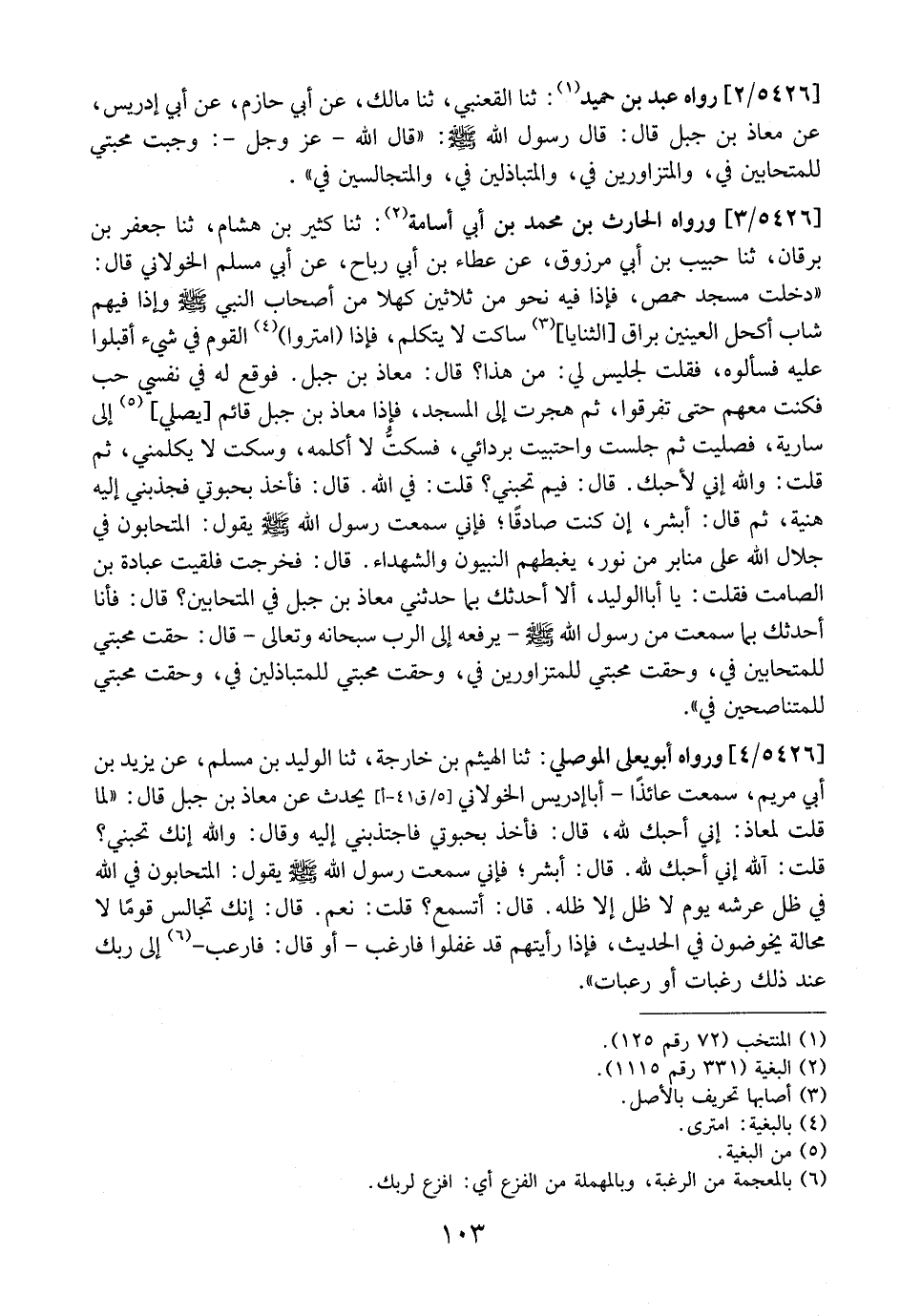 5426 / 3 - وَرَوَاهُ الْحَارِثُ بْنُ مُحَمَّدِ بْنِ أَبِي أُسَامَةَ: ثَنَا كَثِيرُ بْنُ هِشَامٍ، ثَنَا جَعْفَرُ بْنُ بَرْقَانَ، ثَنَا حَبِيبُ بْنُ أَبِي مَرْزُوقٍ، عَنْ عَطَاءِ بْنِ أَبِي رَبَاحٍ، عَنْ أَبِي مُسْلِمٍ الْخَوْلَانِيِّ قَالَ: "دَخَلْتُ مَسْجِدَ حِمْصَ، فَإِذَا فِيهِ نَحْوٌ مِنْ ثَلَاثِينَ كَهْلًا مِنْ أَصْحَابِ النَّبِيِّ - صَلَّى اللَّهُ عَلَيْهِ وَسَلَّمَ - وَإِذَا فِيهِمْ شَابٌّ أَكْحَلُ الْعَيْنَيْنِ بَرَّاقُ الثَّنَايَا، سَاكِتٌ لَا يَتَكَلَّمْ، فَإِذَا امْتَرَوُا الْقَوْمُ فِي شَيْءٍ أَقْبَلُوا عَلَيْهِ فَسَأَلُوهُ، فَقُلْتُ لِجَلِيسٍ لِي: مَنْ هَذَا قَالَ: مُعَاذُ بْنُ جَبَلٍ. فَوَقَعَ لَهُ فِي نَفْسِي حُبٌّ فَكُنْتُ مَعَهُمْ حَتَّى تَفَرَّقُوا، ثُمَّ هَجَرْتُ إِلَى الْمَسْجِدِ، فَإِذَا مُعَاذُ بْنُ جَبَلٍ قَائِمٌ يُصَلِّي، إِلَى سَارِيَةٍ، فَصَلَّيْتُ ثُمَّ جَلَسْتُ واحتبيت بردائي، فسكتُّ لَا أُكَلِّمُهُ، وَسَكَتَ لَا يُكَلِّمُنِي، ثُمَّ قُلْتُ: وَاللَّهِ إِنِّي لَأُحِبُّكَ. قَالَ: فِيمَ تُحِبُّنِي؟ قُلْتُ: فِي اللَّهِ. قَالَ: فَأَخَذَ بِحُبْوَتِي فَجَذَبَنِي إِلَيْهِ هُنَيَّةً، ثُمَّ قَالَ: أَبْشِرْ، إِنْ كُنْتَ صَادِقًا؟ فَإِنِّي سَمِعْتُ رَسُولَ اللَّهِ - صَلَّى اللَّهُ عَلَيْهِ وسلم - يَقُولُ: الْمُتَحَابُّونَ فِي جَلَالِ اللَّهِ عَلَى مَنَابِرٍ مِنْ نُورٍ، يَغْبِطُهُمُ النَّبِيُّونَ وَالشُّهَدَاءُ. قَالَ: فَخَرَجْتُ فَلَقِيتُ عُبَادَةَ بْنَ الصَّامِتِ فَقُلْتُ: يَا أَبَا الْوَلِيدِ، أَلَا أُحَدِّثُكَ بِمَا حَدَّثَنِي مُعَاذُ بْنُ جَبَلٍ فِي الْمُتَحَابِّينَ؟ قَالَ: فَأَنَا أُحَدِّثُكَ بِمَا سَمِعْتُ مِنْ رَسُولِ اللَّهِ - صَلَّى اللَّهُ عَلَيْهِ وَسَلَّمَ - يَرْفَعُهُ إِلَى الرَّبِّ سُبْحَانَهُ وَتَعَالَى- قَالَ: حَقَّتْ مَحَبَّتِي لِلْمُتَحَابِّينَ فِيَّ، وَحَقَّتْ مَحَبَّتِي لِلْمُتَزَاوِرِينَ فِيَّ، وَحَقَّتْ مَحَبَّتِي لِلْمُتَبَاذِلِينَ فِيَّ، وَحَقَّتْ مَحَبَّتِي لِلْمُتَنَاصِحِينَ فِيَّ".