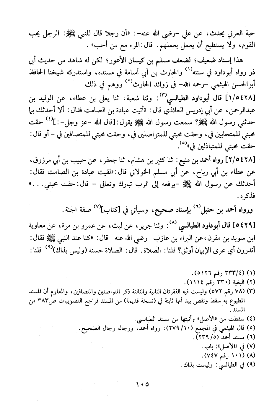5428 / 1 - قَالَ أَبُو دَاوُدَ الطيالسي: وثنا شُعْبَةُ، ثَنَا يَعْلَى بْنُ عَطَاءٍ، عَنِ الْوَلِيدِ بْنِ عَبْدِ الرَّحْمَنِ، عَنْ أَبِي إِدْرِيسَ الْعَائِذِيِّ قَالَ: "أتيت عبادة بن الصامت فقال: ألا أحدثك بما حدثني رَسُولِ اللَّهِ صَلَّى اللَّهُ عَلَيْهِ وَسَلَّمَ؟ سَمِعْتُ رسول الله - صلى الله عليه وسلم - يقول: قال اللَّهُ- عَزَّ وَجَلَّ-: حَقَّتْ مَحَبَّتِي لِلْمُتَحَابِّينَ فِيَّ وَحَقَّتْ مَحَبَّتِي لِلْمُتَوَاصِلِينَ في، وحقت محبتي للمتصافين فِيَّ- أَوْ قَالَ: حَقَّتْ مَحَبَّتِي لِلْمُتَبَاذِلِينَ فِيَّ".