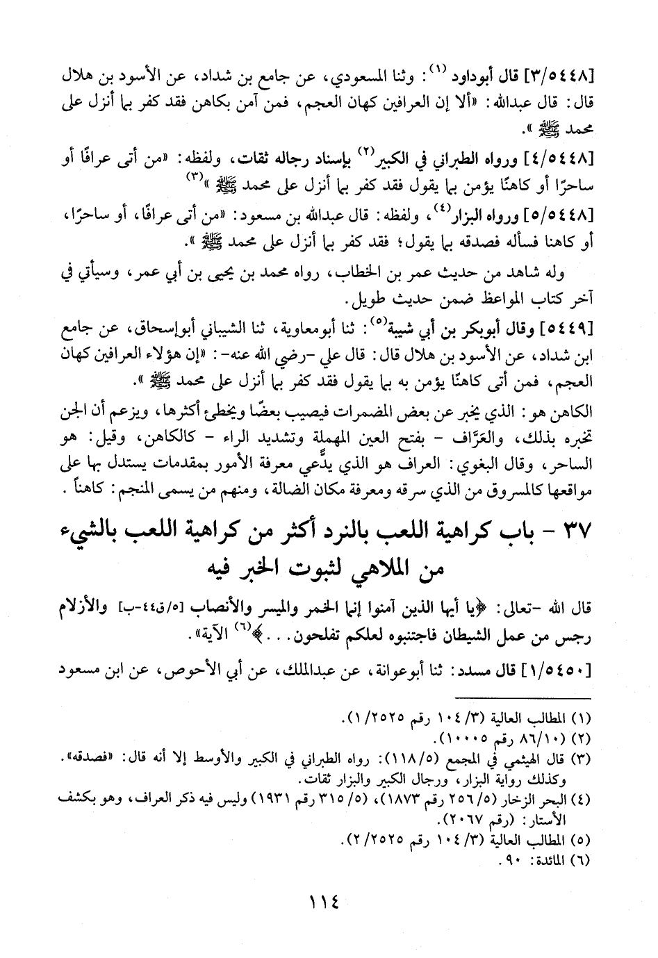 5449 - وَقَالَ أَبُو بَكْرِ بْنُ أَبِي شَيْبَةَ: ثنا أبو معاوية، ثَنَا الشَّيْبَانِيُّ أَبُو إِسْحَاقَ، عَنْ جَامِعِ بْنِ شداد، عن الأسود بن هلال قَالَ: قَالَ عَلِيٌّ- رَضِيَ اللَّهُ عَنْهُ-: "إِنَّ هَؤُلَاءِ الْعَرَّافِينَ كُهَّانُ الْعَجَمِ، فَمَنْ أَتَى كَاهِنًا يُؤْمِنُ بِهِ بِمَا يَقُولُ فَقَدْ كَفَرَ بِمَا أُنْزِلَ عَلَى مُحَمَّدٍ - صَلَّى اللَّهُ عَلَيْهِ وَسَلَّمَ -".