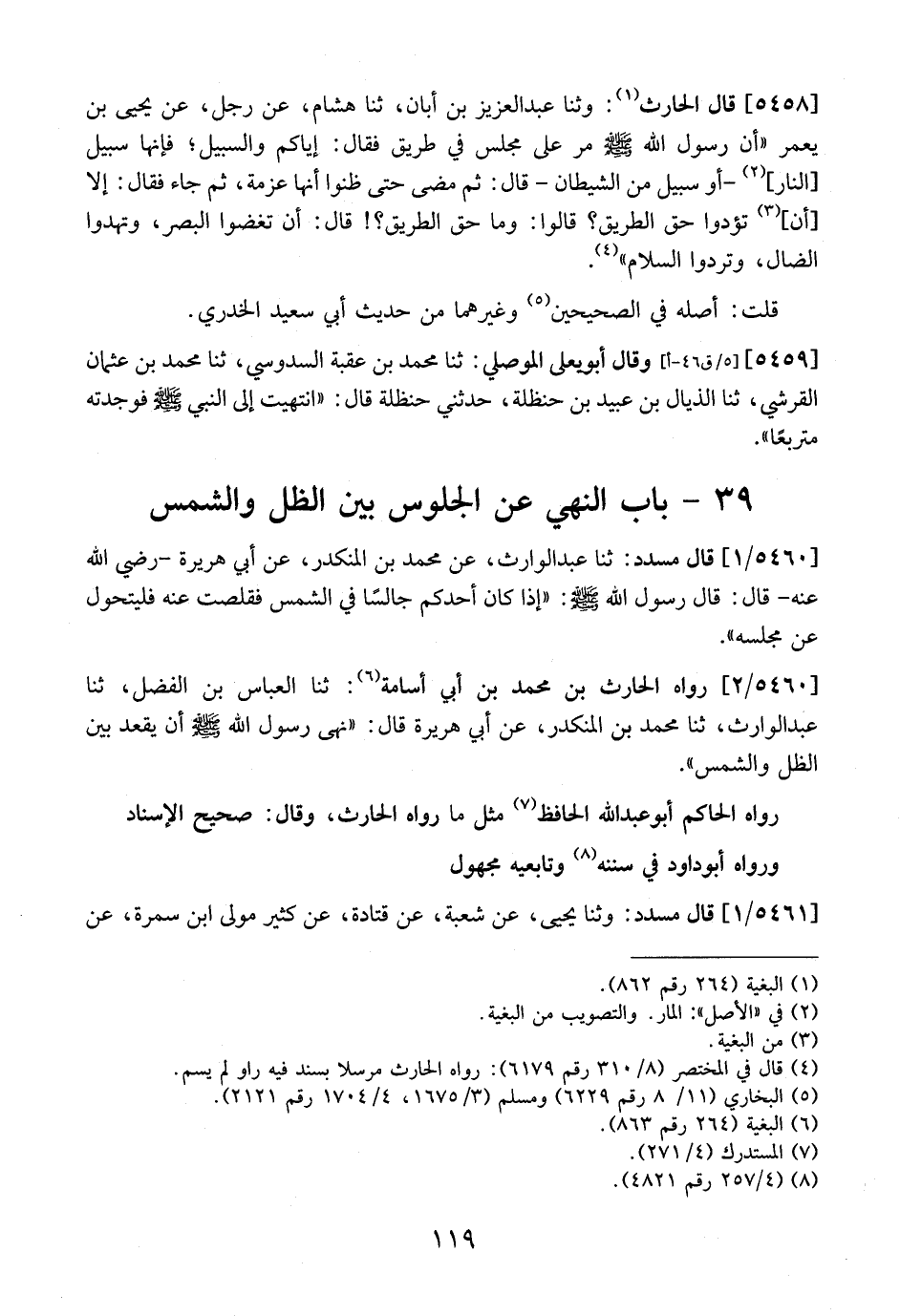 5460 / 2 - رَوَاهُ الْحَارِثُ بْنُ مُحَمَّدِ بْنِ أَبِي أُسَامَةَ: ثَنَا الْعَبَّاسُ بْنُ الْفَضْلِ، ثَنَا عَبْدُ الْوَارِثِ، ثَنَا مُحَمَّدُ بْنُ الْمُنْكَدِرِ، عَنْ أَبِي هُرَيْرَةَ قَالَ: "نَهَى رَسُولُ اللَّهِ - صَلَّى اللَّهُ عَلَيْهِ وسلم - إن يقعد بين الظل والشمس".