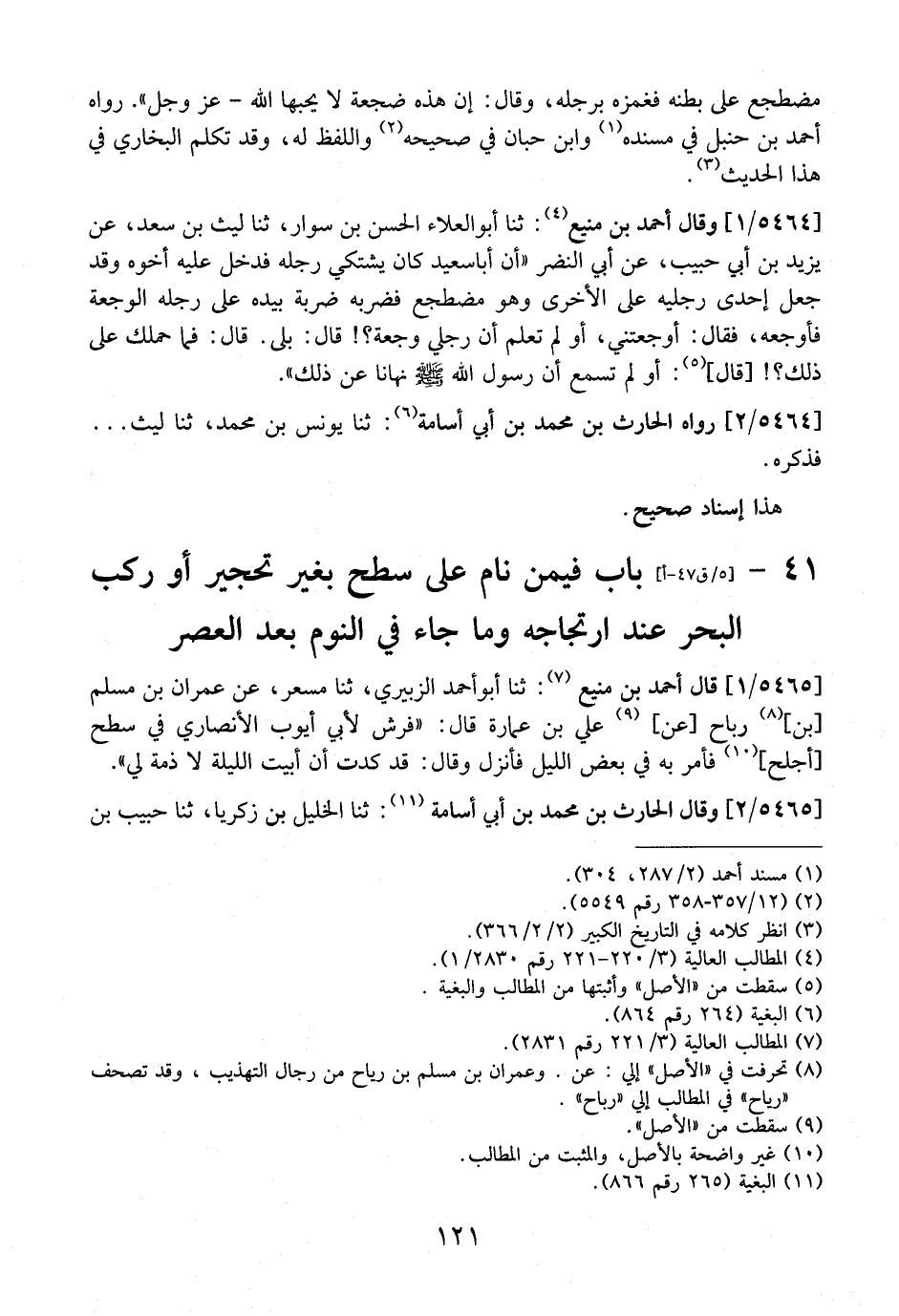 5464 / 1 - وَقَالَ أَحْمَدُ بْنُ مَنِيعٍ: ثَنَا أَبُو الْعَلَاءِ الْحَسَنُ بْنُ سَوَّارٍ، ثَنَا لَيْثُ بْنُ سَعْدٍ، عَنْ يَزِيدَ بْنِ أَبِي حَبِيبٍ، عَنْ أَبِي النَّضْرِ "أَنَّ أَبَا سَعِيدٍ كَانَ يَشْتَكِي رِجْلَهُ فَدَخَلَ عَلَيْهِ أَخُوهُ وَقَدْ جَعَلَ إِحْدَى رِجْلَيْهِ عَلَى الْأُخْرَى وَهُوَ مضطجع فضربه ضربة بِيَدِهِ عَلَى رِجْلِهِ الْوَجِعَةِ فَأَوْجَعَهُ، فَقَالَ: أَوْجَعْتَنِي، أَوَلَمْ تَعْلَمْ أَنَّ رِجْلِي وَجِعَةٌ؟! قَالَ: بَلَى. قال: ما حَمَلَكَ عَلَى ذَلِكَ؟! قَالَ: أَوَ لَمْ تَسْمَعْ أن رسول الله - صلى الله عليه وسلم - نَهَانَا عَنْ ذَلِكَ".