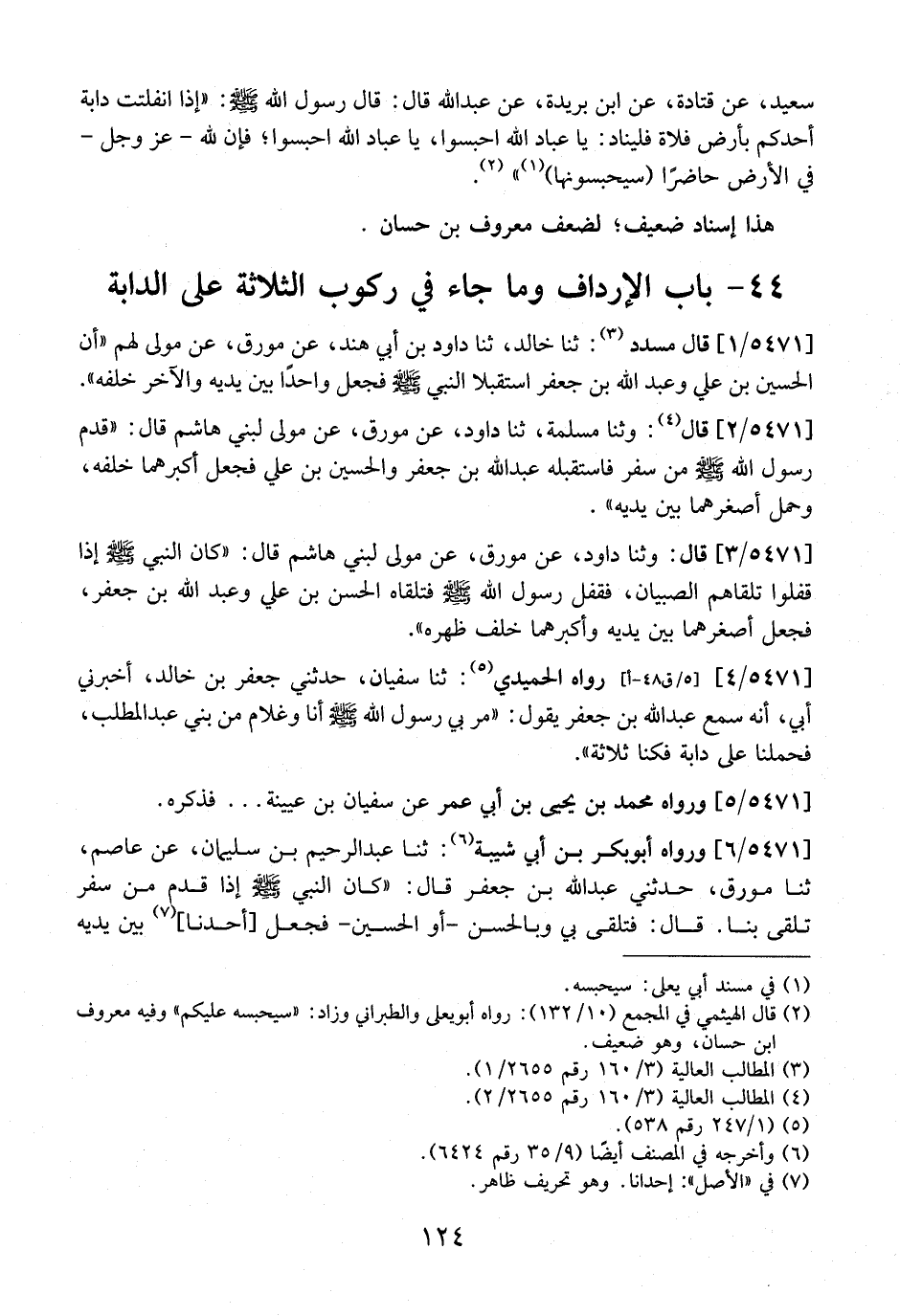 5471 / 1 - قال مسدد: ثنا خالد، ثنا داود بن أبي هند، عن مورق، عن مولى لهم "أن الحسين بن علي وعبد الله بن جعفر استقبلا النبي - صلى الله عليه وسلم - فجعل واحدا بين يديه والآخر خلفه".