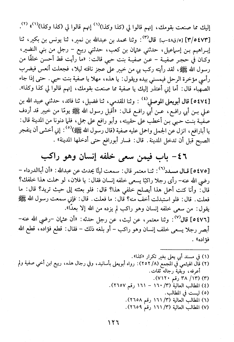 5474 - قال أبو يعلى الموصلي: وثنا المقدمي، ثنا فضيل، ثنا فائد، حدثني عُبَيْدِ اللَّهِ بْنِ عَلِيِّ بْنِ أَبِي رَافِعٍ، عَنْ أَبِي رَافِعٍ قَالَ: "أَقْبَلَ رَسُولِ اللَّهِ - صَلَّى اللَّهُ عَلَيْهِ وَسَلَّمَ - يَوْمًا من خيبر قد أردف صفية بنت حيي بن أخطب على حقيبته، وأبو رافع على جمل، فلما دنونا من المدينة قال: يا أبا رافع، انزل عن الجمل واحمل عليه صفية قال رسول الله - صلى الله عليه وسلم -: إني أخشى أن ينفجر الصبح قبل أن تدخل المدينة. قال: فسار أبو رافع حتى أدخلها المدينة".