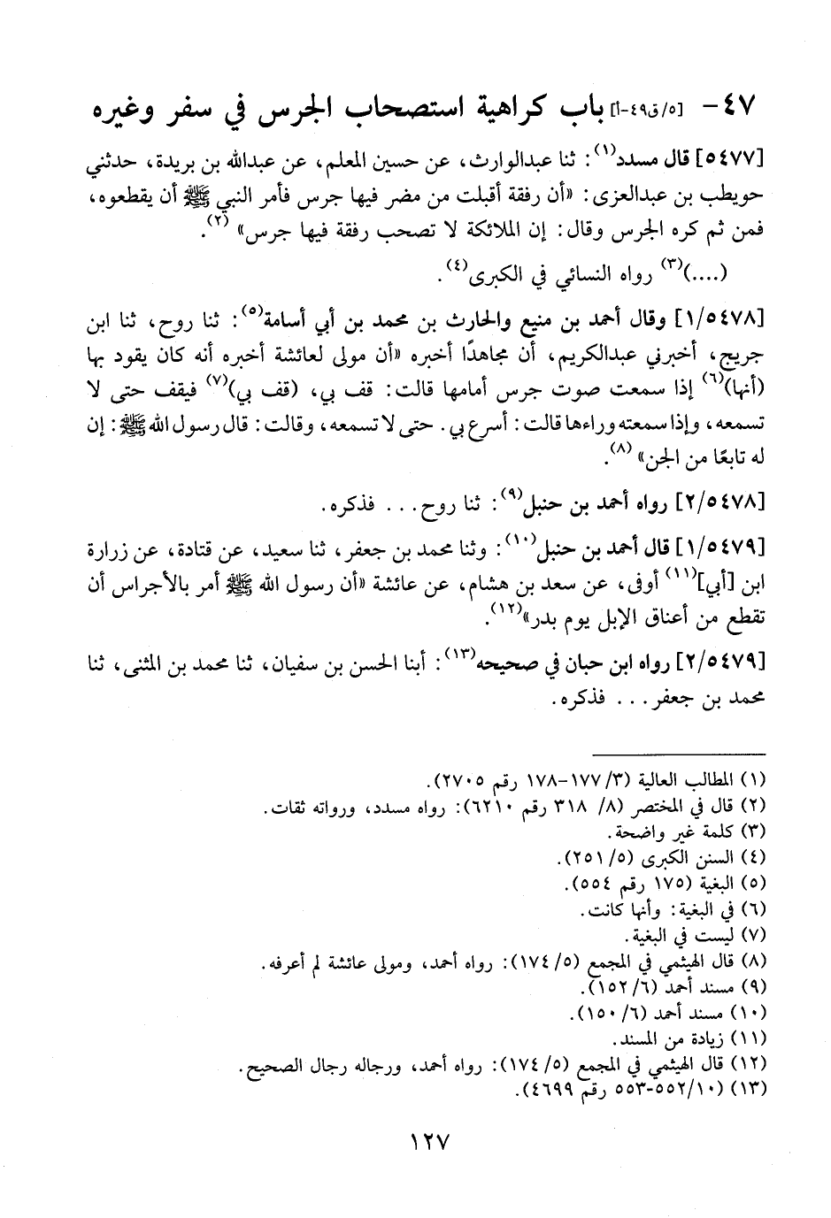 5477 - قال مسدد: ثنا عبد الوارث، عن حسين المعلم، عن عبد الله بن بريدة، حدثني حويطب بن عبد العزى: "أن رفقة أقبلت من مضر فيها جرس فَأَمَرَ النَّبِيُّ - صَلَّى اللَّهُ عَلَيْهِ وَسَلَّمَ - أَنْ يقطعوه، فمن ثم كره الجرس وقال: إن الملائكة لا تصحب رفقة فيها جرس".