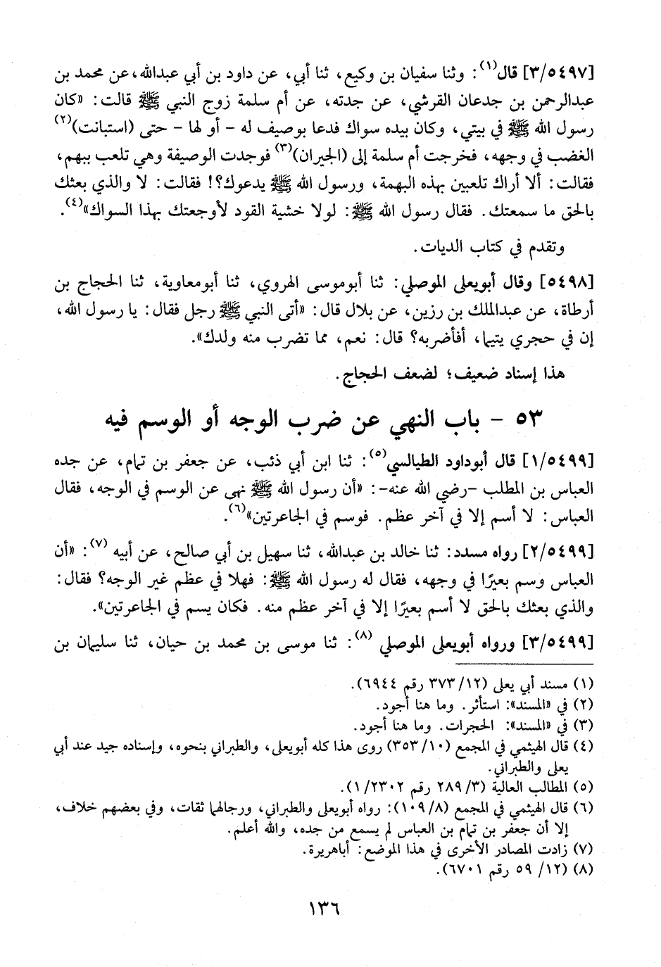5499 / 2 - رَوَاهُ مُسَدَّدٌ: ثنا خَالِدُ بْنُ عَبْدِ اللَّهِ، ثَنَا سُهَيْلُ بْنُ أَبِي صَالِحٍ، عَنْ أَبِيهِ: "أن العباس وسم بعيراً في وجهه، فَقَالَ لَهُ رَسُولُ اللَّهِ - صَلَّى اللَّهُ عَلَيْهِ وسلم -: فهلا في عظم غير الوجه؟ فقال: والذي بعثك بالحق لا أسم بعيرا إلا في آخر عظم منه. فكان يسم في الجاعرتين".