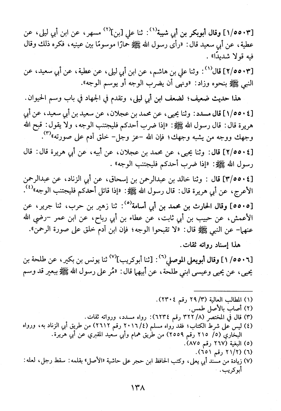 5503 / 1 - وَقَالَ أَبُو بَكْرِ بْنُ أَبِي شَيْبَةَ: ثنا عَلِيُّ بْنُ مِسْهَرٍ، عَنِ ابْنُ أَبِي لَيْلَى، عَنْ عَطِيَّةَ، عَنْ أَبِي سَعِيدٍ قَالَ: "رَأَى رَسُولُ اللَّهِ - صَلَّى اللَّهُ عَلَيْهِ وَسَلَّمَ - حِمَارًا مَوْسُومًا بَيْنَ عَيَنَيْهِ، فَكَرِهَ ذَلِكَ وَقَالَ فِيهِ قَوْلًا شَدِيدًا".