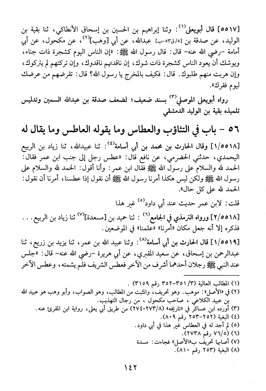 5518 / 1 - وَقَالَ الْحَارِثُ بْنُ مُحَمَّدِ بْنِ أَبِي أُسَامَةَ: ثَنَا عُبَيْدُ اللَّهِ، ثَنَا زِيَادُ بْنُ الرَّبِيعِ الْيَحْمَدِيُّ، حَدَّثَنِي الْحَضْرَمِيُّ، عَنْ نَافِعٍ قَالَ: "عَطَسَ رَجُلٌ إِلَى جَنْبِ ابْنِ عُمَرَ فَقَالَ: الْحَمْدُ لِلَّهِ وَالسَّلَامُ عَلَى رَسُولِ اللَّهِ - صَلَّى اللَّهُ عَلَيْهِ وَسَلَّمَ - فَقَالَ ابْنُ عُمَرَ: وَأَنَا أَقُولُ: الْحَمْدُ لِلَّهِ وَالسَّلَامُ عَلَى رَسُولِ اللَّهِ - صَلَّى اللَّهُ عَلَيْهِ وَسَلَّمَ - وَلَكِنْ لَيْسَ هَكَذَا أَمَرَنَا رَسُولُ اللَّهِ - صَلَّى اللَّهُ عَلَيْهِ وَسَلَّمَ - أَنْ نَقُولَ إِذَا عَطَسْنَا، أَمَرَنَا أَنْ نَقُولَ: الْحَمْدُ لِلَّهِ عَلَى كُلِّ حَالٍ".