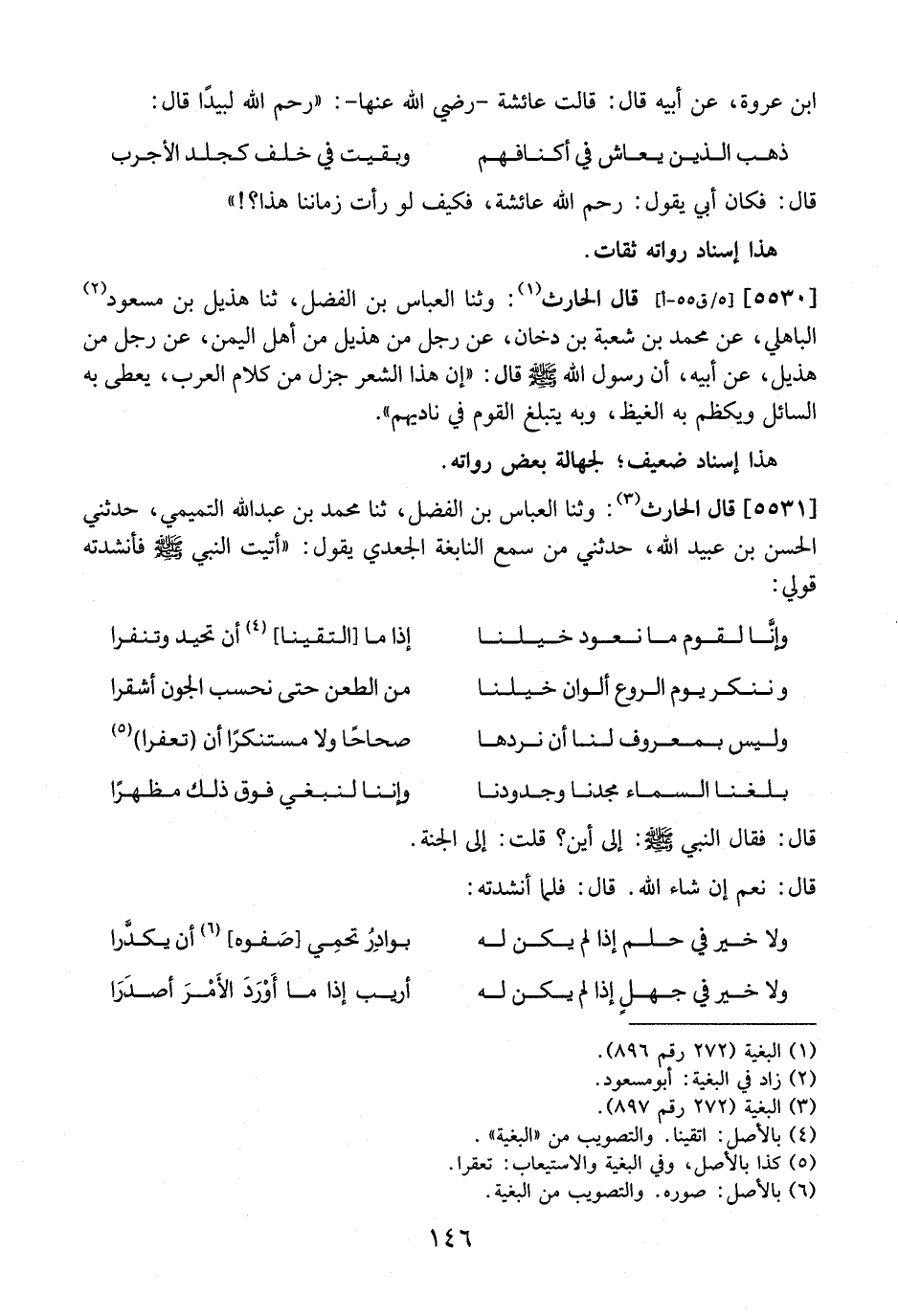 5531 - قَالَ الْحَارِثُ: وَثَنَا الْعَبَّاسُ بْنُ الْفَضْلِ، ثَنَا مُحَمَّدُ بْنُ عَبْدِ اللَّهِ التَّمِيمِيُّ، حدثني الحسن بْنُ عُبَيْدِ اللَّهِ، حَدَّثَنِي مَنْ سَمِعَ النَّابِغَةَ الْجَعْدِيَّ يَقُولُ: "أَتَيْتُ النَّبِيَّ - صَلَّى اللَّهُ عَلَيْهِ وسلم - فأنشدته قولي: