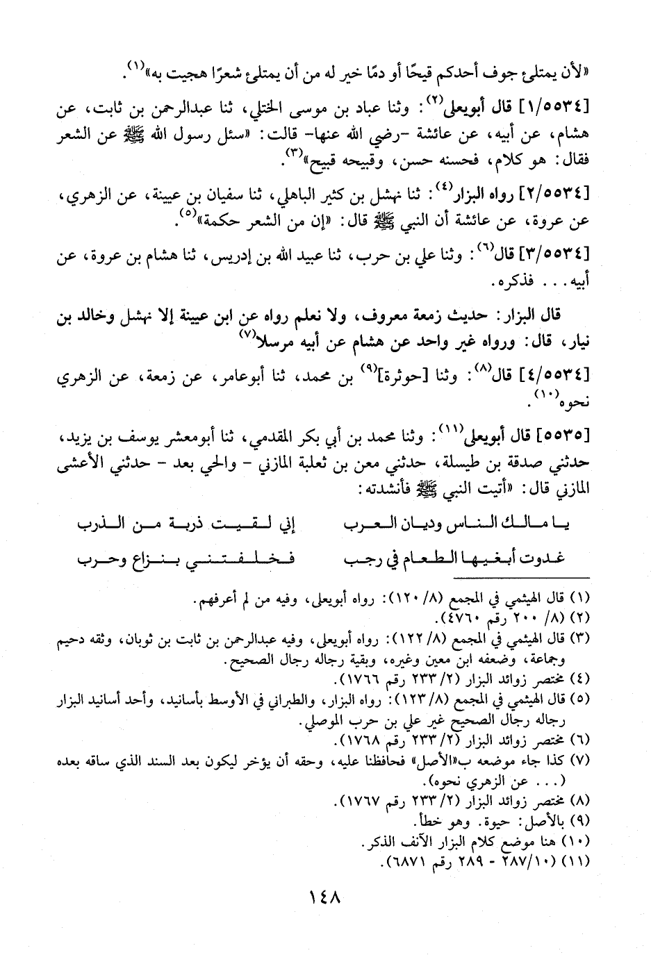 5534 / 2 - رَوَاهُ الْبَزَّارُ: ثَنَا نَهْشَلُ بْنُ كَثِيرٍ الَبَاهِلِيُّ، ثَنَا سُفْيَانُ بْنُ عُيَيْنَةَ، عَنِ الزُّهْرِيِّ، عَنْ عُرْوَةَ، عَنْ عَائِشَةَ أَنَّ النَّبِيَّ - صَلَّى اللَّهُ عَلَيْهِ وَسَلَّمَ - قَالَ: "إِنَّ مِنَ الشِّعْرِ حِكْمَةً".