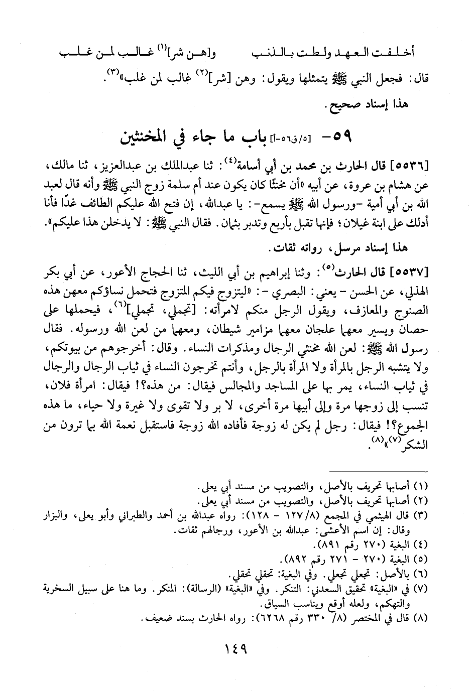 5536 - قَالَ الْحَارِثُ بْنُ مُحَمَّدِ بْنِ أَبِي أُسَامَةَ: ثَنَا عَبْدُ الْمَلِكِ بْنُ عَبْدِ الْعَزِيزِ، ثَنَا مَالِكٌ، عَنْ هِشَامِ بْنِ عُرْوَةَ، عَنْ أَبِيهِ "أن مخنثاً كان يكون عِنْدَ أُمِّ سَلَمَةَ زَوْجِ النَّبِيِّ - صَلَّى اللَّهُ عَلَيْهِ وَسَلَّمَ - وَأَنَّهُ قَالَ لِعَبْدِ اللَّهِ بْنِ أبي أمية- ورسول الله يَسْمَعُ-: يَا عَبْدَ اللَّهِ، إِنْ فَتَحَ اللَّهُ عَلَيْكُمُ الطَّائِفَ غَدًا فَأَنَا أَدُلُّكَ عَلَى ابْنَةِ غِيلَانَ؟ فَإِنَّهَا تُقْبِلُ بِأَرْبَعٍ وَتُدْبِرُ بِثَمَانٍ. فَقَالَ النَّبِيُّ - صَلَّى اللَّهُ عَلَيْهِ وَسَلَّمَ -: لَا يَدْخُلَنَّ هَذَا عَلَيْكُمْ". هَذَا إِسْنَادٌ مُرْسَلٌ، رُوَاتُهُ ثِقَاتٌ.