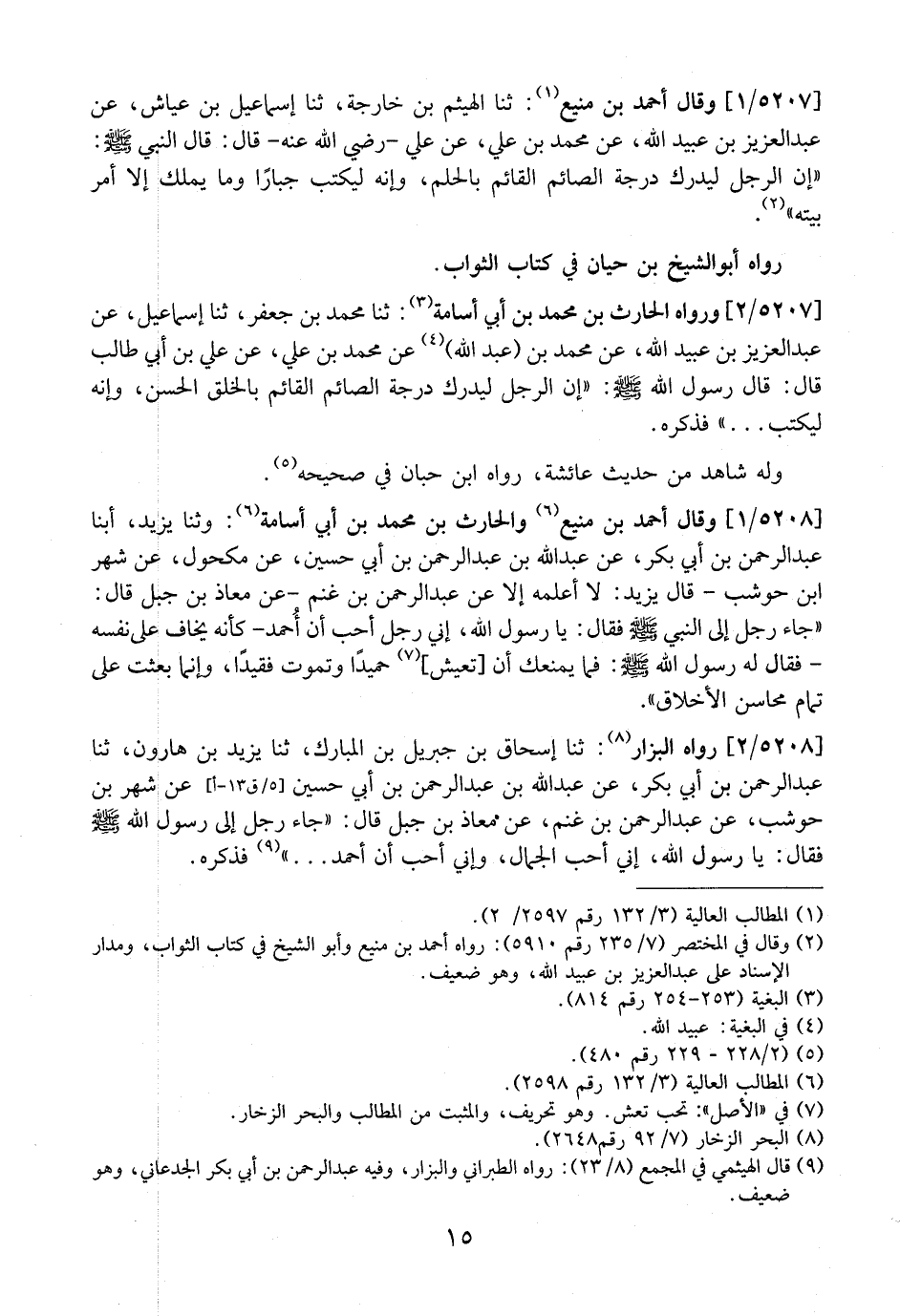 5208 / 2 - رَوَاهُ الْبَزَّارُ: ثَنَا إِسْحَاقُ بْنُ جِبْرِيلَ بْنِ الْمُبَارَكِ، ثَنَا يَزِيدُ بْنُ هَارُونَ، ثَنَا عَبْدُ الرَّحْمَنِ بْنُ أبي بكر، عَنْ عَبْدِ اللَّهِ بْنِ عَبْدِ الرَّحْمَنِ بْنِ أَبِي حُسَيْنٍ عَنْ شَهْرِ بْنِ حَوْشَبٍ، عَنْ عَبْدِ الرَّحْمَنِ بْنُ غَنْمٍ، عنْ مُعَاذِ بْنِ جَبَلٍ قَالَ: "جَاءَ رَجُلٌ إِلَى رَسُولِ اللَّهِ - صَلَّى اللَّهُ عَلَيْهِ وَسَلَّمَ - فَقَالَ: يَا رَسُولَ اللَّهِ، إِنِّي أُحِبُّ الْجَمَالَ، وَإِنِّي أُحِبُّ أَنْ أُحْمَدَ ... " فذكره.