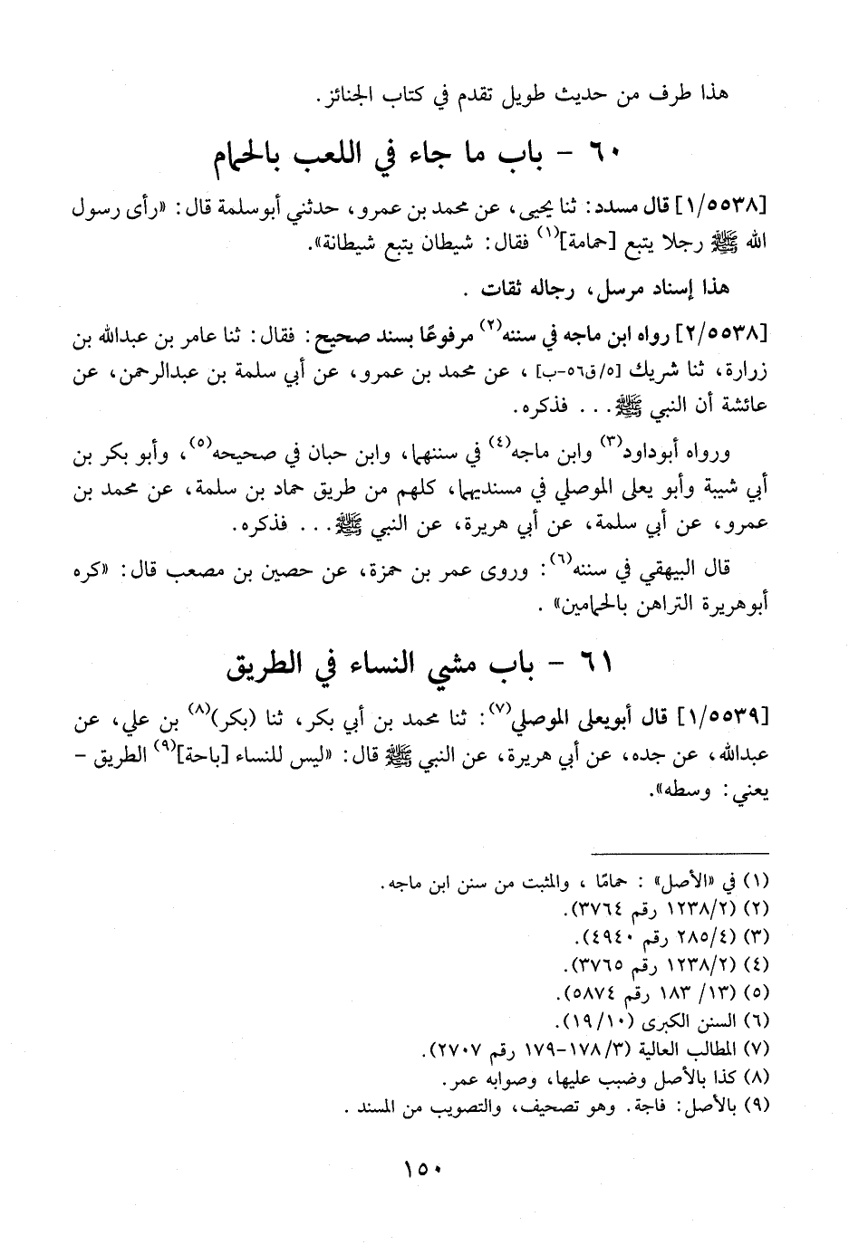 5538 / 1 - قَالَ مُسَدَّدٌ: ثَنَا يَحْيَى، عَنْ مُحَمَّدِ بْنِ عَمْرٍو، حَدَّثَنِي أَبُو سَلَمَةَ قَالَ: "رَأَى رَسُولُ اللَّهِ - صَلَّى اللَّهُ عَلَيْهِ وَسَلَّمَ - رَجُلًا يتبع حمامة، فَقَالَ: شَيْطَانٌ يَتْبَعُ شَيْطَانَةً".