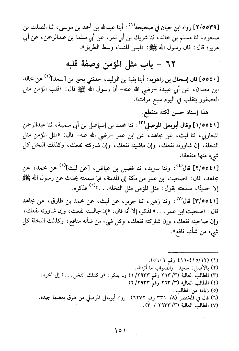 5541 / 1 - وَقَالَ أَبُو يَعْلَى الْمَوْصِلِيُّ: ثَنَا مُحَمَّدُ بْنُ إسماعيل بْنِ أَبِي سُمَيْنَةَ، ثَنَا عَبْدُ الرَّحْمَنِ الْمُحَارِبِيُّ، ثَنَا لَيْثٌ، عَنْ مُجَاهِدٍ، عَنِ ابْنِ عُمَرَ- رَضِيَ اللَّهُ عَنْهُ- قَالَ: "مَثَلُ الْمُؤْمِنِ مَثَلُ النَّخْلَةِ، إِنْ شَاوَرْتَهُ نَفَعَكَ، وَإِنْ مَاشَيْتَهُ نَفَعَكَ، وَإِنْ شَارَكْتَهُ نَفَعَكَ، وَكَذَلِكَ النَّخْلُ كُلُّ شَيْءٍ مِنْهَا مَنْفَعَةٌ".