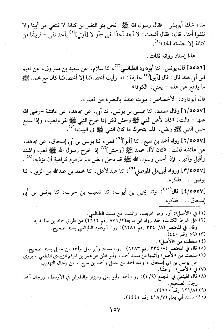 5557 / 2 - رَوَاهُ أَحْمَدُ بْنُ مَنِيعٍ: ثَنَا أَبُو قَطَنٍ، ثَنَا يُونُسُ بْنُ أَبِي إِسْحَاقَ، عَنْ مُجَاهِدٍ، عَنْ عَائِشَةَ قَالَتْ: "كَانَ لِآلِ مُحَمَّدٍ - صَلَّى اللَّهُ عليه وسلم - وحش، إذَا خَرَجَ رَسُولُ اللَّهِ - صَلَّى اللَّهُ عَلَيْهِ وَسَلَّمَ - لعب واشتد وأقبل وأدبر، فإذا أَحَسَّ رَسُولُ اللَّهِ - صَلَّى اللَّهُ عَلَيْهِ وَسَلَّمَ - قَدْ دَخَلَ رَبَضَ وَلَمْ يَتَرَمْرَمْ كَرَاهِيَةَ أَنْ يُؤْذِيَهُ".