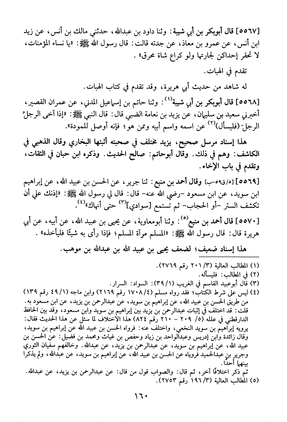 5570 - قَالَ أَحْمَدُ بْنُ مَنِيعٍ: وَثَنَا أَبُو مَعَاوِيَةَ، عَنْ يَحْيَى بْنِ عُبَيْدِ اللَّهِ، عَنْ أَبِيهِ، عَنْ أَبِي هُرَيْرَةَ قَالَ: قَالَ رَسُولُ اللَّهِ - صَلَّى اللَّهُ عَلَيْهِ وسلم -: "الْمُسْلِمُ مِرْآةُ الْمُسْلِمِ؟ فَإِذَا رَأَى بِهِ شَيْئًا فَلْيَأْخُذْهُ". هَذَا إِسْنَادٌ ضَعِيفٌ؟ لِضَعْفِ يَحْيَى بْنِ عُبَيْدِ اللَّهِ بْنُ عَبْدِ اللَّهِ بْنِ مَوْهِبٍ.