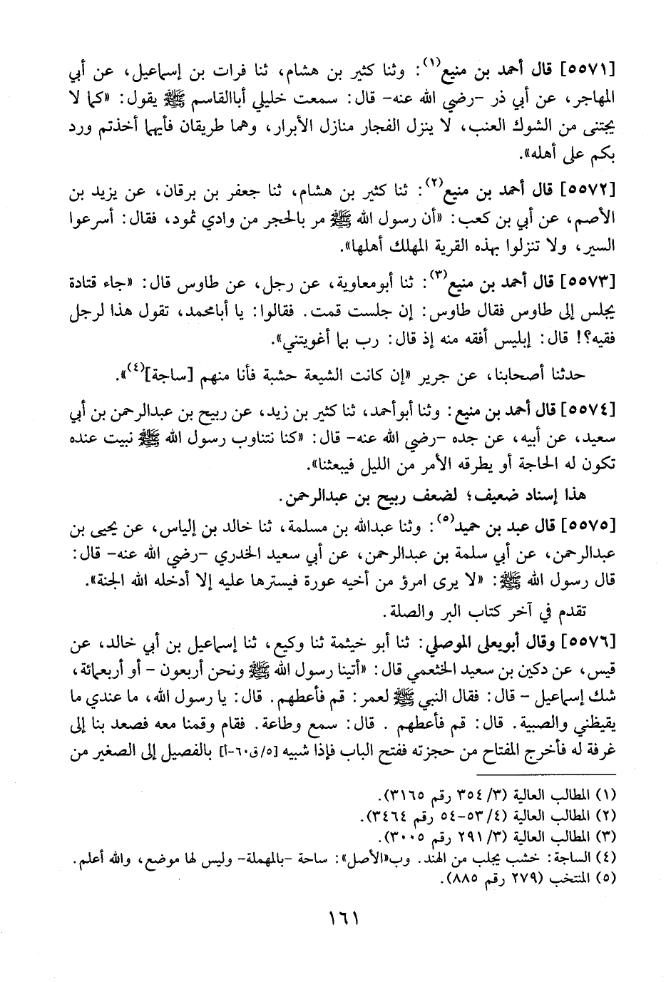 5572 - قَالَ أَحْمَدُ بْنُ مَنِيعٍ: ثَنَا كَثِيرُ بْنُ هِشَامٍ، ثَنَا جَعْفَرُ بْنُ بُرْقَانَ، عَنْ يَزِيدَ بْنِ الْأَصَمِّ، عَنْ أُبَيِّ بْنِ كَعْبٍ: "أَنّ رَسُولَ اللَّهِ - صَلَّى اللَّهُ عَلَيْهِ وَسَلَّمَ - مَرَّ بِالْحِجْرِ مِنْ وَادِي ثَمُودَ، فَقَالَ: أَسْرِعُوا السَّيْرَ، وَلَا تَنْزِلُوا بِهَذِهِ الْقَرْيَةِ الْمُهْلَكِ أَهْلُهَا".