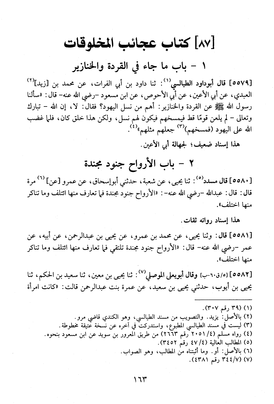 5579 - قَالَ أَبُو دَاوُدَ الطَّيَالِسِيُّ: ثَنَا دَاوُدُ بْنُ أَبِي الْفُرَاتِ، عَنْ مُحَمَّدِ بْنِ زيد الْعَبْدِيِّ، عَنْ أَبِي الْأَعْيَنِ، عَنْ أَبِي الْأَحْوَصِ، عَنِ ابْنِ مَسْعُودٍ- رَضِيَ اللَّهُ عَنْهُ- قَالَ: "سَأَلْنَا رَسُولَ اللَّهِ - صَلَّى اللَّهُ عَلَيْهِ وَسَلَّمَ - عَنِ الْقِرَدَةِ وَالْخَنَازِيرِ: أَهُمْ مِنْ نَسْلِ الْيَهُودِ؟ فَقَالَ: لَا، إِنَّ اللَّهَ- تَبَارَكَ وَتَعَالَى-لَمْ يلعن قوماً قط فيمسخهم فَيَكُونَ لَهُمْ نَسْلٌ، وَلَكِنْ هَذَا خَلْقٌ كَانَ، فَلَمَّا غَضِبَ اللَّهُ عَلَى الْيَهُودِ فَمَسَخَهُمْ جَعَلَهُمْ مِثْلَهُمْ".